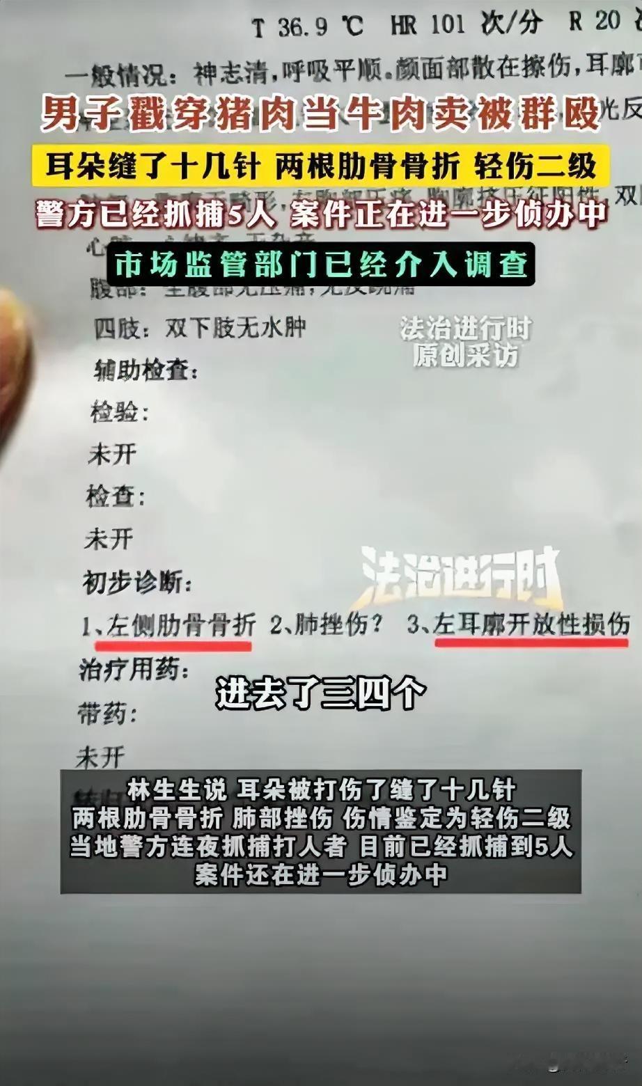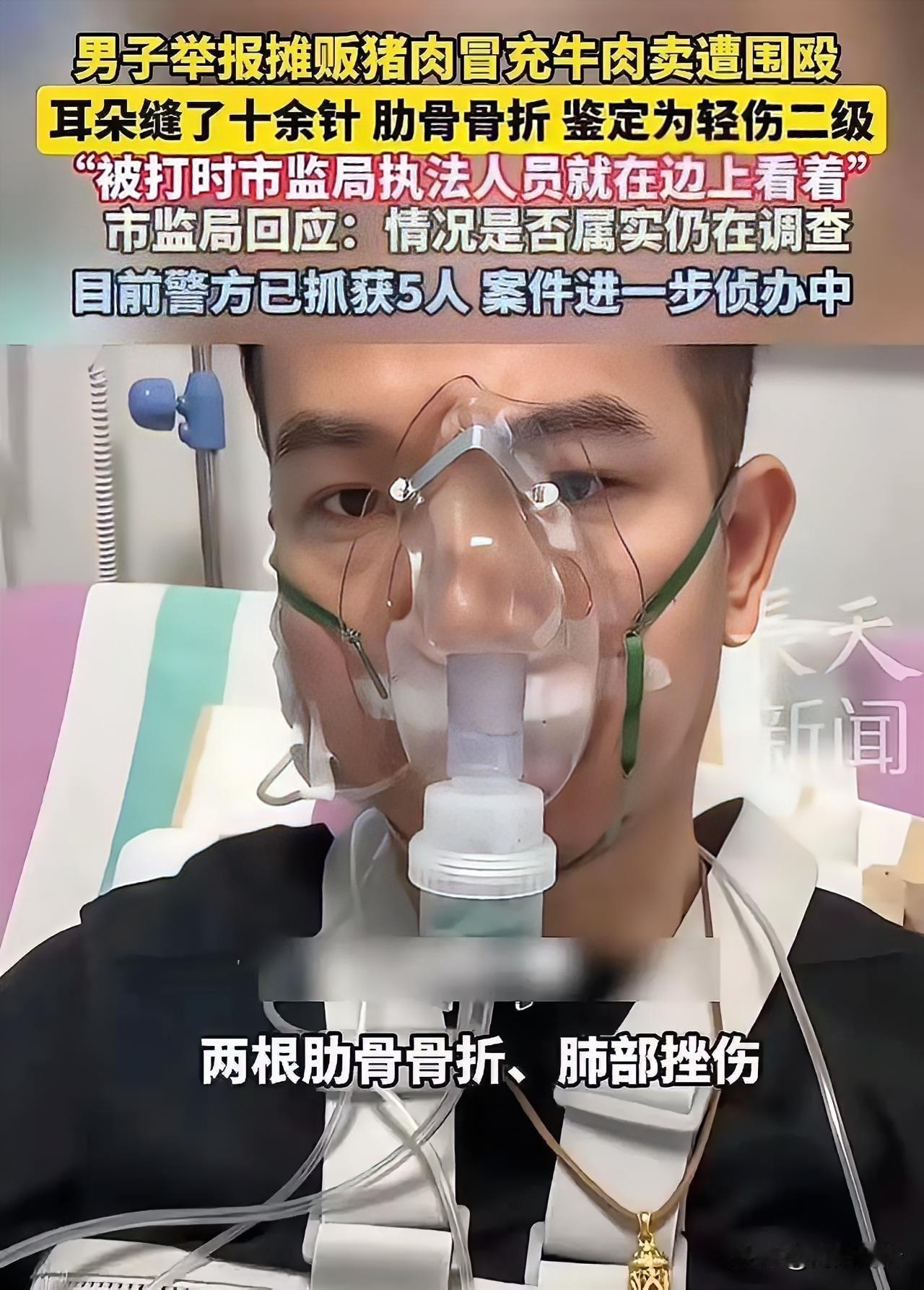 这也太让人寒心了! 打假主播林先生在广东潮州市场监督管理局执法人员眼皮子底下被几人围殴,造成轻伤二级。 好在警方及时赶到抓获了打人者,涉事商家也受到了处罚。 但最让人无法接受的是,施暴过程中,执法人员就在5米开外看着,全程未介入,也未记录现场。 那5米的距离里,缺失的是什么?是勇气?是担当?还是“多一事不如少一事”的心态? 执法人员的职责是维护市场秩序和保护群众安全,面对暴力竟成了“看客”,这不仅是失职,更是对违法者的纵容。 如果正义得不到保护,谁还敢站出来打假?