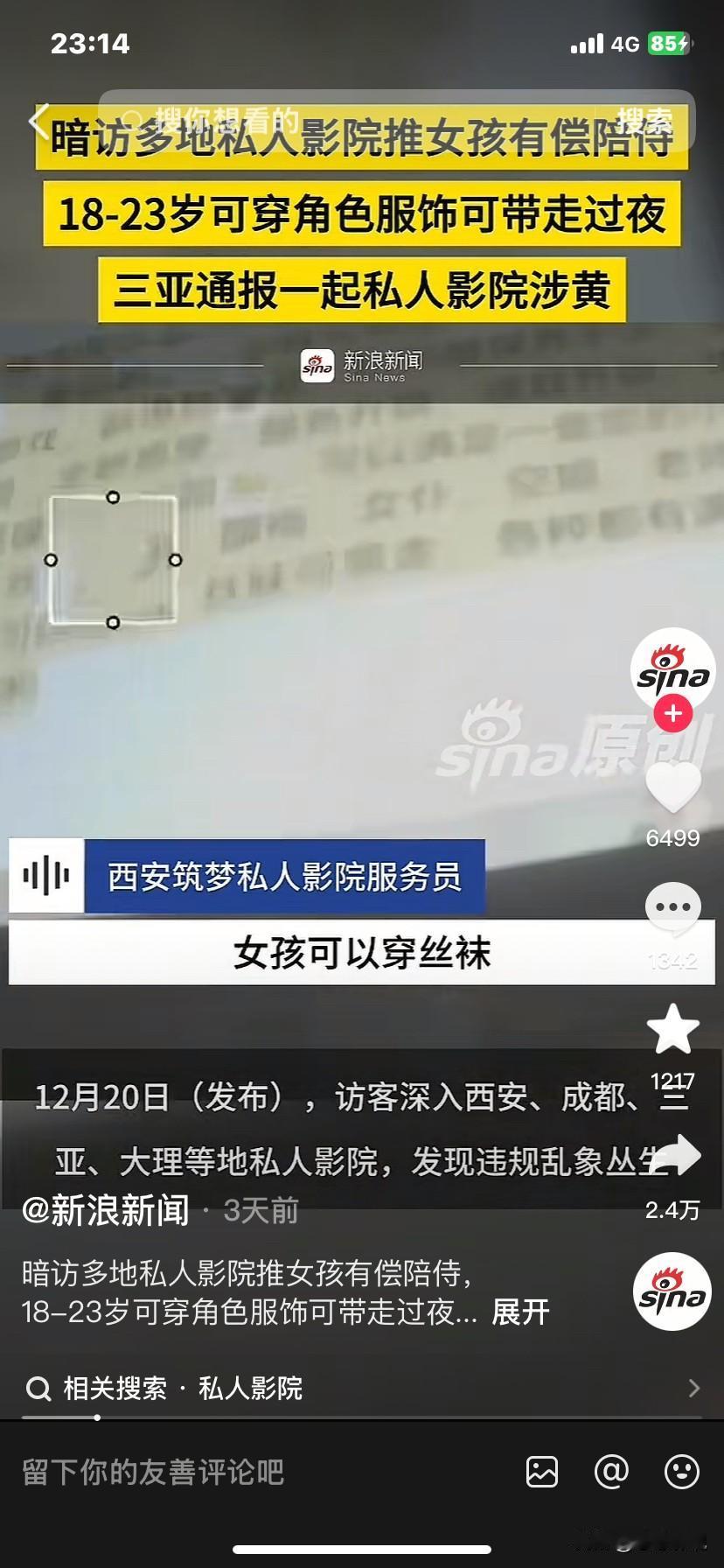 私人影院第一次听说,最近看了新闻才知道还有私人影院。 西安私人影院涉黄风波:从暗访曝光到警方雷霆出击 在人们的印象中,私人影院本应是提供个性化观影体验的休闲场所,可谁能想到,部分私人影院竟打着观影的幌子,干起了涉黄的勾当。近日,西安一家名为“筑梦”的私人影院就因组织陪侍服务被推上了舆论的风口浪尖。 事情的起因颇具戏剧性。一位男子来到这家位于西安的私人影院,本想选择99元的观影套餐,工作人员却告知他没有该套餐,最低消费为299元,且有女孩陪看。更令人咋舌的是,工作人员还介绍,若选择999元的套餐,不仅能享受更开放的服务,甚至还能把女孩带回去过夜。男子假装感兴趣询问详情,对方表示价钱越高,服务越开放,999元的套餐能“手两次”。 察觉到异样的男子,以记者的身份悄悄向警方举报。然而,当民警赶到现场后,并未发现明显的违法证据,调查一番后便先行离开。可就在民警离开后不久,又有男子进入影院进行交易,似乎一切照旧。这一情况让举报者感到无奈,也让人们对私人影院的监管产生了质疑。 直到12月21日,西安雁塔分局发布通报,才让这起事件有了新的进展。原来,这家“筑梦”私人影院的4名经营者潘某敏(男)、温某宝(男)、张某龙(男)、王某静(女),以“服务套餐”为名,组织人员向消费者提供陪侍服务,非法牟利,造成了不良社会影响。目前,4名经营者已被依法刑事拘留,3名陪侍人员也受到了行政处罚,案件正在进一步办理中。 其实,西安并非个例。在成都、三亚等地,也有类似的私人影院存在违规行为。在成都,部分私人影院提供异性陪侍服务,甚至暗示顾客可以将陪侍人员带走过夜;在三亚,一些私人影院则提供“擦边”游戏服务,价格越高,内容越露骨。这些现象表明,私人影院涉黄问题已成为一个不容忽视的社会问题。 附近居民表示,早觉得这家影院行为异常。每天晚上都有人员频繁进出,行为举止不像是单纯来看电影,如今发生这样的事情,大家都觉得早有预兆。私人影院的这些违规行为,不仅违反了《娱乐场所管理条例》中关于不得提供以营利为目的陪侍行为的规定,也严重扰乱了社会治安秩序,败坏了社会风气。 此次事件的曝光,也让人们看到了私人影院监管中存在的漏洞。由于私人影院的经营模式较为私密,监管难度较大,一些不法分子便趁机钻空子。此次西安警方的行动,无疑给其他违规经营者敲响了警钟。公安机关表示,将持续保持对违法犯罪行为的“零容忍”态度,坚决净化社会治安环境。同时,也提醒各经营主体要严格遵守法律法规,依法诚信经营。西安主题酒吧 西安涉黄 西安ktv包间
