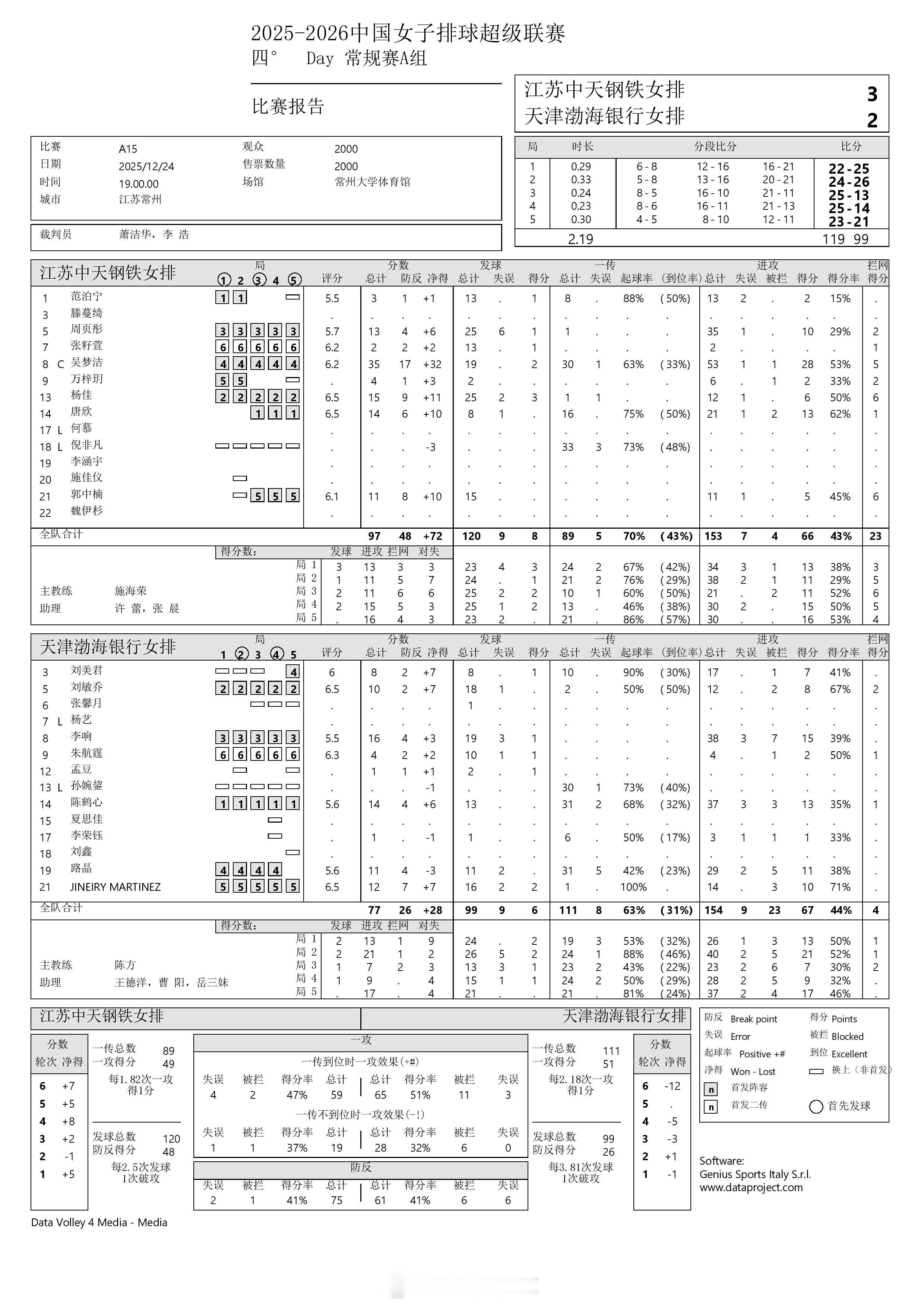 【中国女排超级联赛江苏3-2天津得分统计】24日晚,2025-2026赛季A级