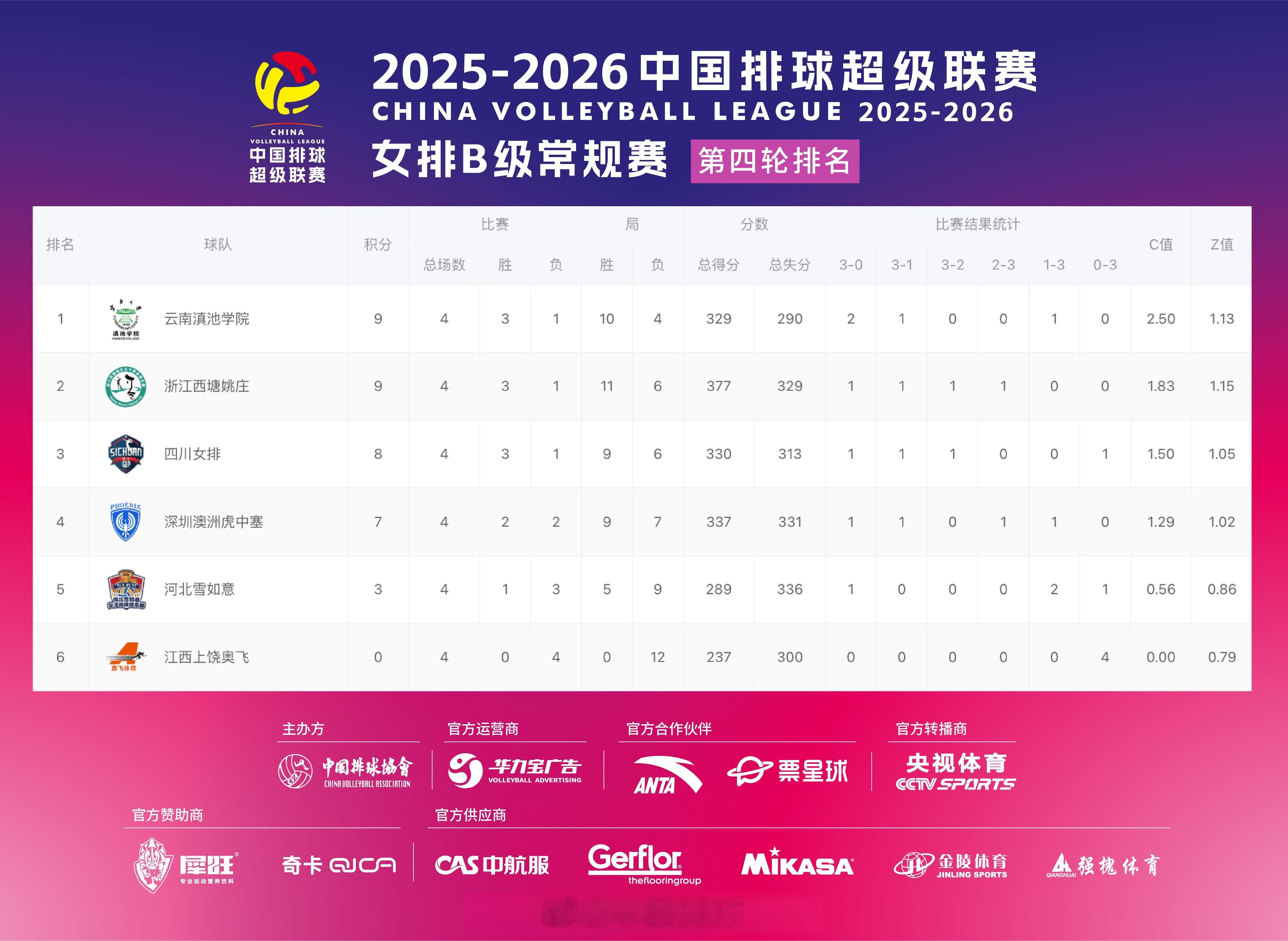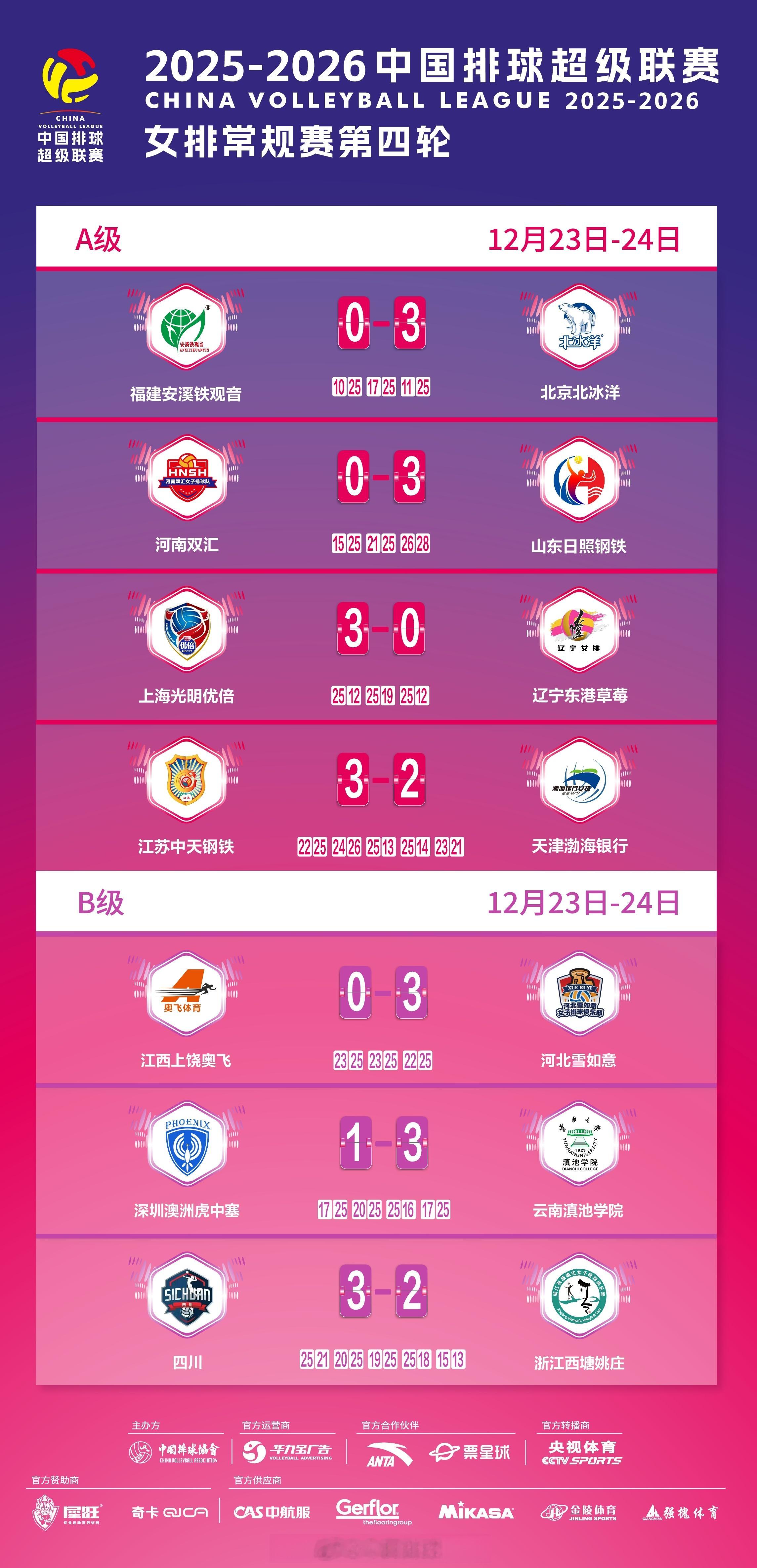 2025-2026中国女排超级联赛 A级和B级常规赛第4轮比赛结果和此轮过后的积分排名。