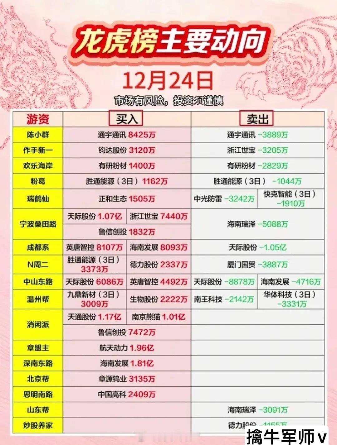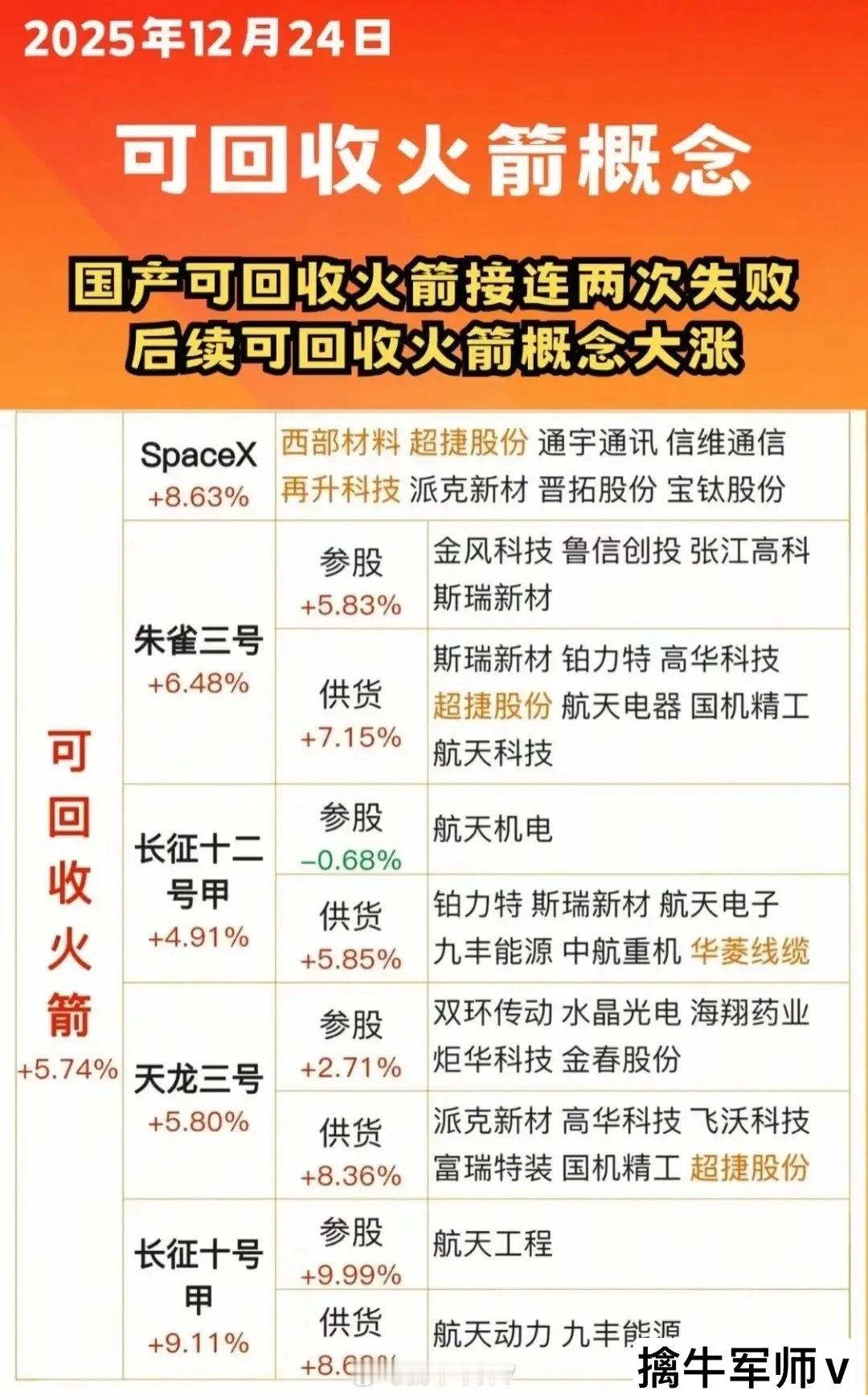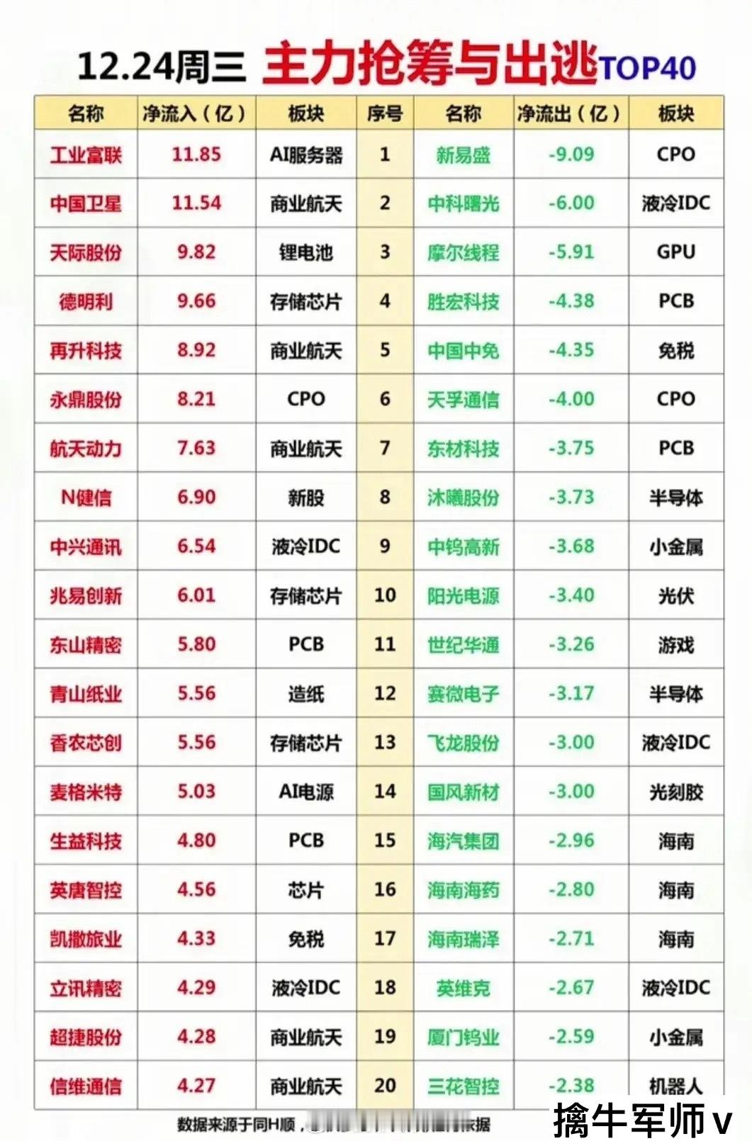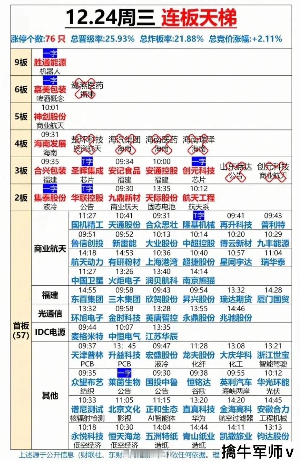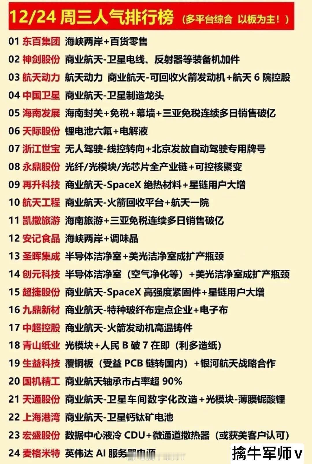 底部放量名单+主力资金动向+蓝箭航天概念+火箭回收概念+个股人气榜+游资龙虎榜+市场高度榜、热门题材概念梳理等等!12月24日连板天梯与涨停板复盘,当日涨停76只,总晋级率25.93%,商业航天成为绝对主线,神剑股份5连板扛起板块大旗,海南、海峡两岸概念也多点开花,胜通能源9连板坐稳高度龙头。12月24日人气排行榜:东百集团凭借海峡两岸+百货零售拿下榜首,神剑股份、航天动力等商业航天概念股紧随其后,成为榜单主力阵营。海南发展、浙江世宝等标的也凭借各自题材亮点跻身前列。理财有风险入市需谨慎!资料取材网络仅供参考不能作为投资依据
