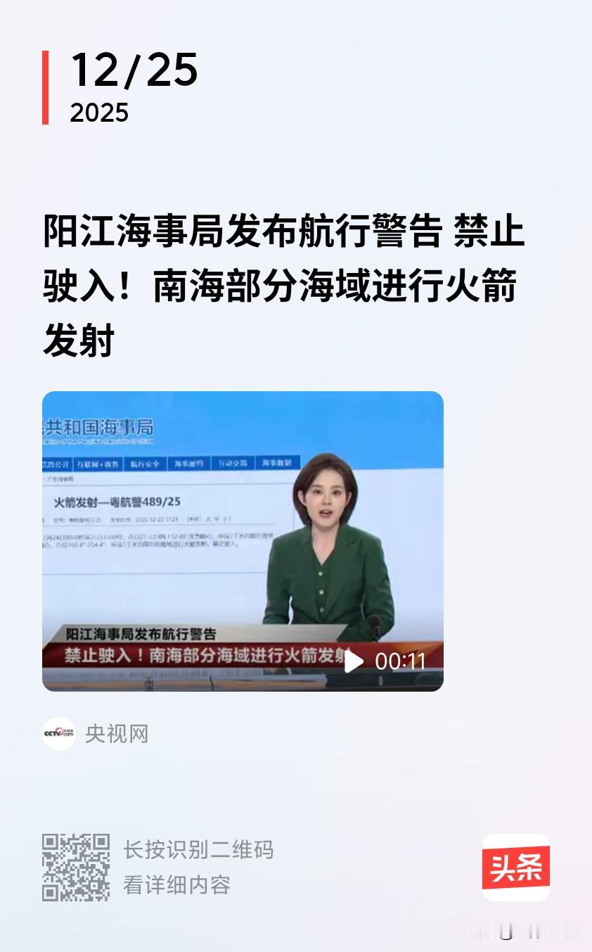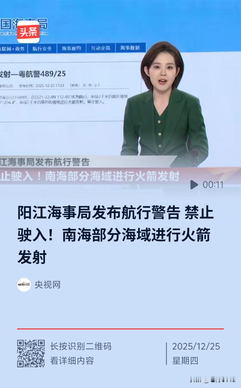 据中国海事局网站消息,阳江海事局发布航行警告,12月24日8时至26日16时,南海部分海域(以21 - 22.4N 112 - 07.9E为圆心,半径3千米的圆形海域内和以21 - 22.4N 112 - 07.9E为圆心,方位168.4° - 204.4°,半径5千米的扇形的海域 )进行火箭发射,禁止驶入。 此举主要是为确保火箭发射安全,提前对海上交通预警。中国过往多次发射任务都会发布类似航行禁令,如长征系列火箭在海南文昌发射时,也曾通知海上禁航。 另外,此次选择南海国际航道作为落区,也展示出中国顶尖的太空垃圾管理能力,能够精准计算火箭残骸落点,提前划定安全区。