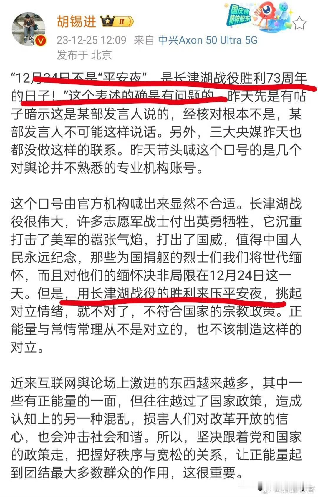 胡锡进在2023年12月24日明确表示,将平安夜与长津湖战役胜利纪念日(1950