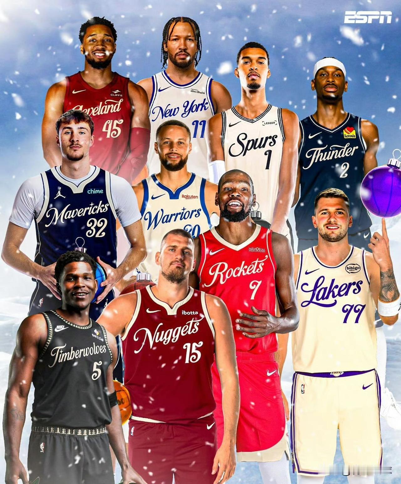 詹姆斯、浓眉没排面了! 今天,美媒BR制作了本赛季参加圣诞大战球队的圣诞经典球衣,为即将到来的圣诞大战预热,各球队当家球星登上大海报,勇士队库里、骑士队米切尔、火箭队、杜兰特、马刺队文班亚马、掘金队约基奇、森林狼队爱德华兹、尼克斯队布伦森、雷霆队亚历山大。 有意思的是,独行侠队是弗拉格而不是浓眉,湖人队是东契奇而不是詹姆斯,这也宣告詹姆斯和浓眉都已经不是球队的头牌球星了,未来是属于年轻人的。