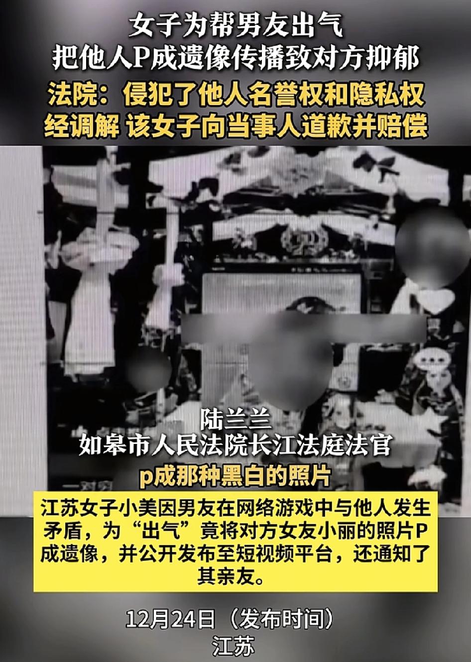 江苏一女子由于其男友在网上打游戏时与别人发生争执,女子为了帮男友出气,把对方的照片P成黑白色,并附上一些骂人的言语发布在网络上还通知了其亲友,导致了对方心里不安,抑郁。最终对方把女子告至法院,女子的行为侵犯了别人的名誉,最终女子向对方赔偿,道歉。网络绝不是法外之地,一定要注意自己的言行。