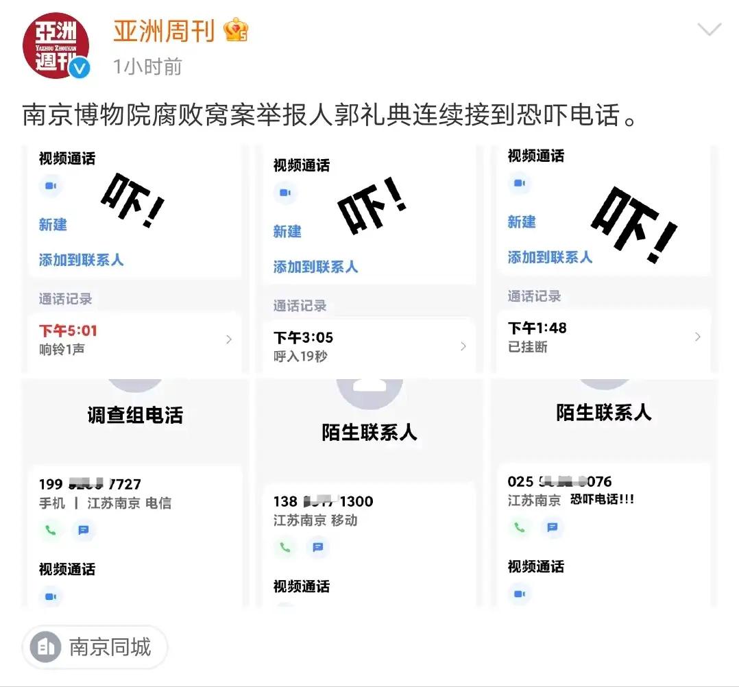 根据亚洲周刊12月24日傍晚发布的消息,南京博物院腐败窝案的举报人郭礼典近日接连收到恐吓电话。这种行为实在令人震惊,也让人不禁要问:这到底是想掩盖什么? 调查组的同志们也请务必多加小心。眼前的局面,简直像电视剧里的剧情一样曲折险恶……大家一定要提高警惕,保护好自己。