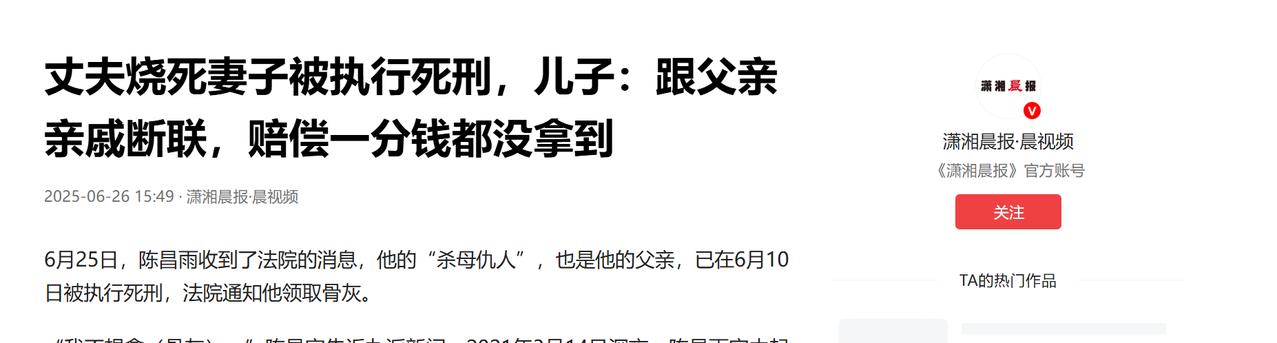 “今生只有杀母仇人,没有父亲!”云南,男子家暴妻子,妻子不堪忍受睡沙发,男子就拿汽油洒满屋,还洒在妻子的脸上,然后在妻子脸上点火,要烧死妻子,其儿子知道后,亲自报了警,将父亲送了进去,父亲被判了死刑之后,他甚至骨灰都不领。 这场悲剧的根源,是常年笼罩在这个家庭的家暴阴影,陈昌雨的父亲陈继卫,从他刚满月时就因持刀抢劫入狱十年,这十年里母亲禹秀英独自扛起家庭重担,种地养家,操劳到心脏出问题,还做了搭桥手术。 本以为丈夫出狱后能撑起家,没曾想等来的却是变本加厉的折磨,陈继卫将在牢里积攒的戾气,全撒在了妻儿身上,哪怕是陈昌雨放牛时不小心摔倒这样的小事,换来的都不是关心,而是一顿毒打。 禹秀英在这样的痛苦里隐忍了半生,也曾试图挣脱,2020 年她曾起诉离婚,想终结这段令人窒息的婚姻,可在传统观念浓厚的乡下,顾及名声、担心财产分配影响儿子前程,种种顾虑像绳索捆住了她的手脚,最终还是选择了妥协,也为后来的悲剧埋下了隐患。 2021 年 3 月的一个夜晚,矛盾彻底爆发,仅仅因为禹秀英想躲避争吵,打算睡在沙发上,陈继卫就彻底丧失了理智,他拎着汽油桶,疯狂地将助燃剂洒满了整个屋子,甚至残忍地泼在了禹秀英的脸上。 在妻子惊恐的目光中,他点燃了火焰,看着大火吞噬妻子的身体,听着她在地上翻滚哀嚎,陈继卫却在一旁冷眼旁观,没有丝毫施救的动作。 事后他更关心的是转移自己的财产,把自己身上的一点轻伤看得比妻子的性命还重,而禹秀英全身重度烧伤面积超过 55%,嘴巴被烧成黑洞生命垂危,却没能从他那里拿到一分钱医药费。 远在外的陈昌雨得知消息后,赶回家看到母亲的惨状,心中只剩下无尽的痛苦和憎恨,他没有丝毫犹豫,亲手拨通了报警电话,将陈继卫送进了看守所。 为了给母亲讨回公道,陈昌雨接下来的四年,几乎是孤军奋战,在宗族观念厚重的村子里,他的行为被贴上 “不孝子” 的标签,亲戚的指责、村民的侧目、网络上的恶意谩骂接踵而至,连最疼他的外公外婆,起初都劝他回避,怕毁了自己的前程,但陈昌雨无比清醒,这不是家务事,是赤裸裸的故意杀人,他必须让凶手付出代价。 陈继卫被捕后不仅矢口否认罪行,还倒打一耙谎称是妻子自己泼的油,直到禹秀英在病床上忍着剧痛录下指控视频,这场荒唐的谎言才被戳破。 从 2021 年 11 月陈继卫被刑拘,到 2022 年一审被判死刑,再到 2024 年二审维持原判,法律的齿轮缓慢却坚定地转动着,这期间陈昌雨一次次撕开自己的伤口,通过媒体发声,哪怕每次讲述都像在心头剜刀,也从未想过放弃。 2025 年 6 月 25 日,陈继卫被执行死刑,这场持续四年的正义追寻,终于迎来了结局,当法院通知陈昌雨去领取骨灰时,他毫不犹豫地拒绝了,在他眼里那个男人不是父亲,只是杀害母亲的凶手,不值得他多看一眼,更不配得到任何体面,他只打开母亲的微信对话框,敲下了一句迟到四年的话:“我给你报仇了。” 如今陈昌雨终于能放下悬在心头的重担,他要结清母亲身后事的费用,让她入土为安,要努力工作赚钱,安一个温暖的家,把外公外婆接来身边。 他要替母亲好好活下去,践行 “好好生活” 的遗愿,也用自己的经历警示所有人,家暴从不是私事,而是致命的犯罪,面对恶魔唯有勇敢反抗、绝不妥协,才能守住自己的生命与尊严。