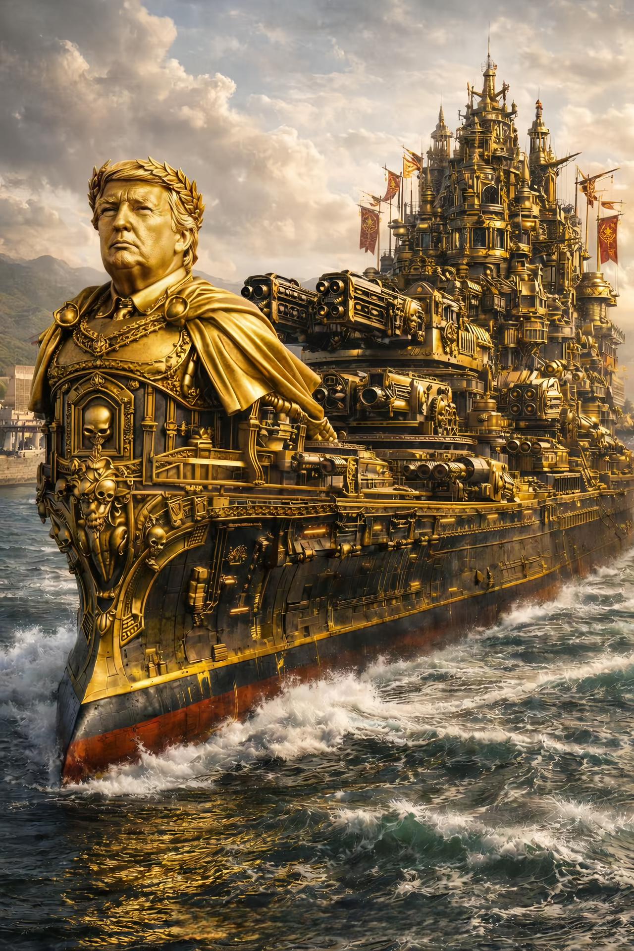 特朗普能整活,可网友也不是吃素的啊。 前几天,川普在海湖庄园宣布要建造人类历史上最先进、最无敌、最美丽的战列舰: 排水量3.5万吨;拥有高超音速导弹、激光武器、电磁炮、核巡航导弹等等,反正就是啥先进上啥,要把它打造成一艘集人类先进武器之大成的无敌武库舰。 联想到之前川普在白宫搞装修的风格,再加上他对这艘无敌战列舰的描述,网友立刻给他生成了一张设计图。 怎么样,够不够豪华,够不够无敌,够不够特朗普? 我敢说,老特看见一定会说:Good,very good![捂脸] 【图片由AI生成】