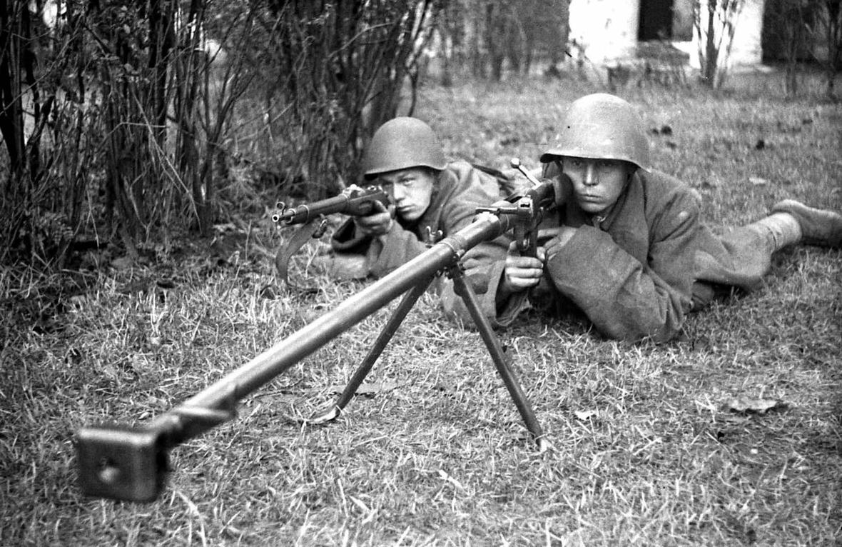 要说男女平等,毛子在二战时是真的做到了“绝对平等”——1943 年,手持 1941 年式捷格加廖夫反坦克枪(ПТРД-41)与 1940 年式托卡列夫半自动步枪的苏联女性,正前往训练场参加集训。这幅作品的标题为《未来的坦克猎手》。 ПТРД-41 反坦克枪是捷格加廖夫设计的单发栓动反坦克枪(参见图2,大家可以看到其惊人的长度),口径 14.5 毫米,全重 17.3 公斤,有效射程 1000 米,发射穿甲弹时可在 100 米距离击穿 40 毫米垂直装甲。该枪专为对抗德军早期坦克(如三号、四号坦克的侧面装甲)设计,缺点是后坐力极大,需经过专业训练才能熟练操作。苏军使用时通常采用两人小组战术:一人负责射击,一人警戒并观察目标(有时也负责装弹),参见图3~4。 像这样体型和后坐力都非常大的枪支,青壮年男性都不一定能轻松使用,而苏联居然由女兵来操作。所以说,要说男女平等,毛子在二战时是真的做到了“绝对平等”(不过有点太绝对了)。