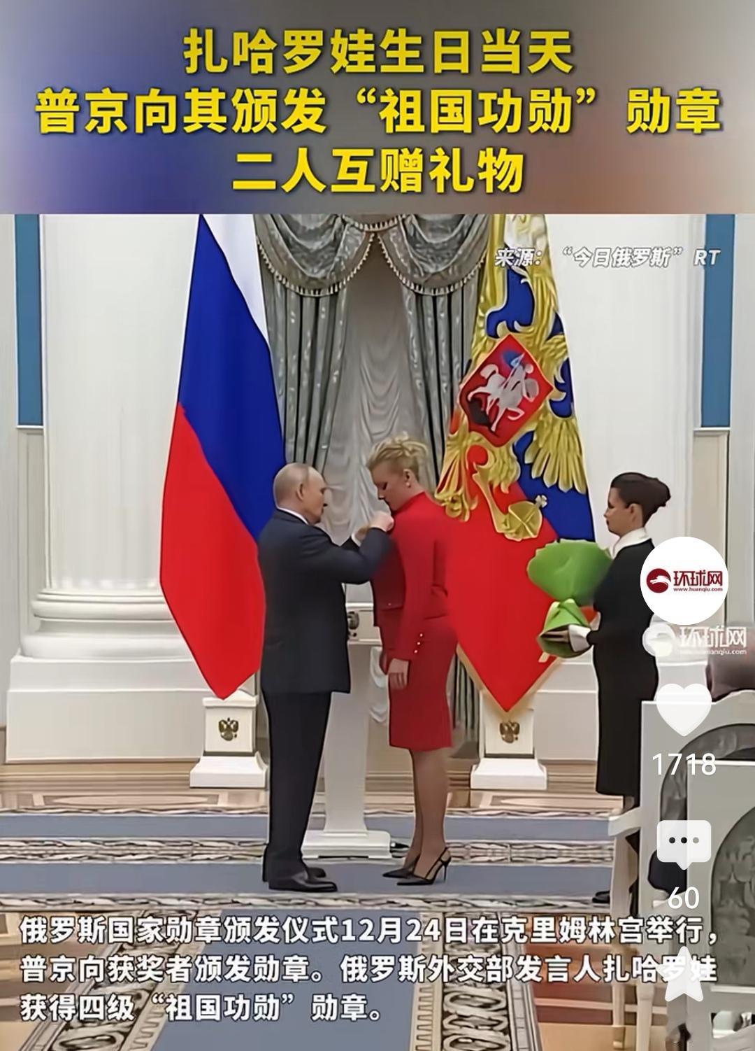 祝贺扎哈罗娃四喜临门! 战斗民族的女性也是好样的。俄罗斯外交部新闻发言人扎哈罗娃在生日当天接受总统普京的祝贺,并接受普京颁发勋章,同事获总统赠送的礼物。正赶上圣诞节,可以说是双喜临门。 扎哈罗娃作为新闻发言人,颇具战斗民族的风格。记得面对日本记者采访时说的话:难道你忘记了曾经的蘑菇云的炽热和西伯利亚的冷风了吗?直怼的日本记者哑口无言。 我们祝福扎哈罗娃生日快乐🎂🎂🎂🎂🎂[福][福][福][福][福]