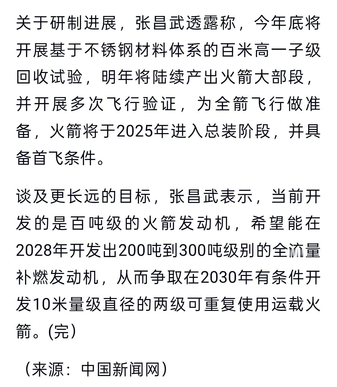 一条2023年旧闻— —张昌武2023年透露的蓝箭航天目标;朱雀三号2025年进入总装阶段,并具备首飞条件。希望能在2028年开发出200吨到300吨级别的全流量补燃发动机,从而争取在2030年有条件开发10米量级直径的两级可重复使用运载火箭。到2025年年底已完成的目标;朱雀三号基础版完成首飞,220吨级全流量补燃循环液氧甲烷发动机“蓝焱”完成整机试车。
