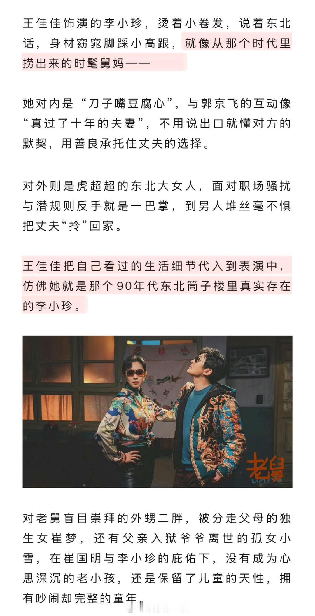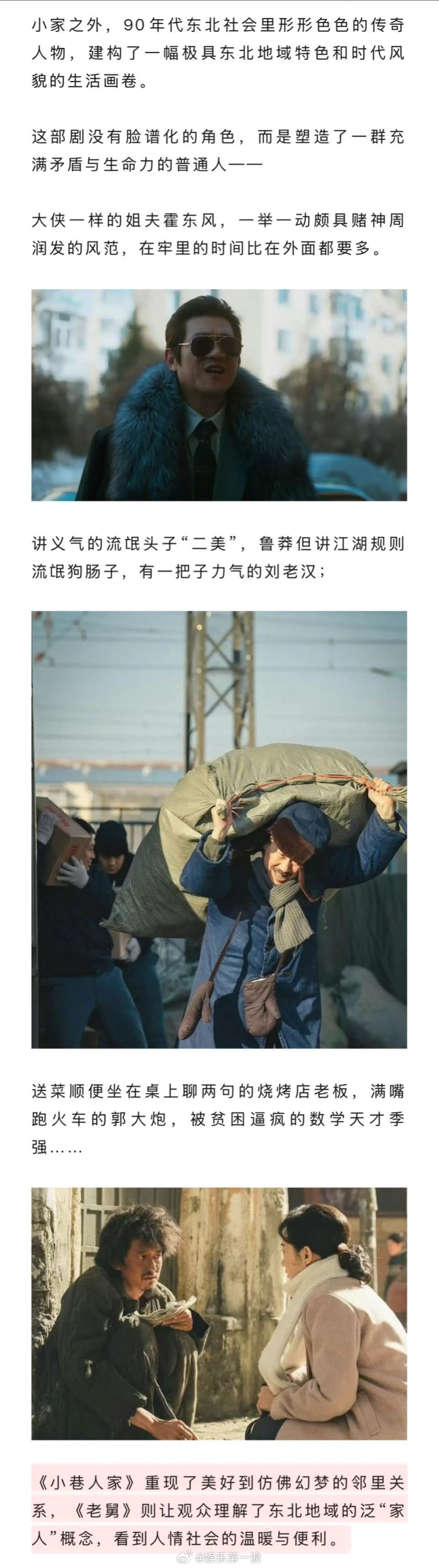 年代剧里的失败者还能让人共情吗 年代剧为什么钟爱东北叙事 《老舅》的温馨群像:王佳佳饰演的李小珍,烫着小卷发,说着东北话,身材窈窕脚踩小高跟,就像从那个时代里捞出来的时髦舅妈。对老舅盲目崇拜的外甥二胖,被分走父母的独生女崔梦,还有父亲入狱爷爷离世的孤女小雪,在老舅舅妈的庇佑下,得以保留儿童的天性,拥有吵闹却完整的童年。↓