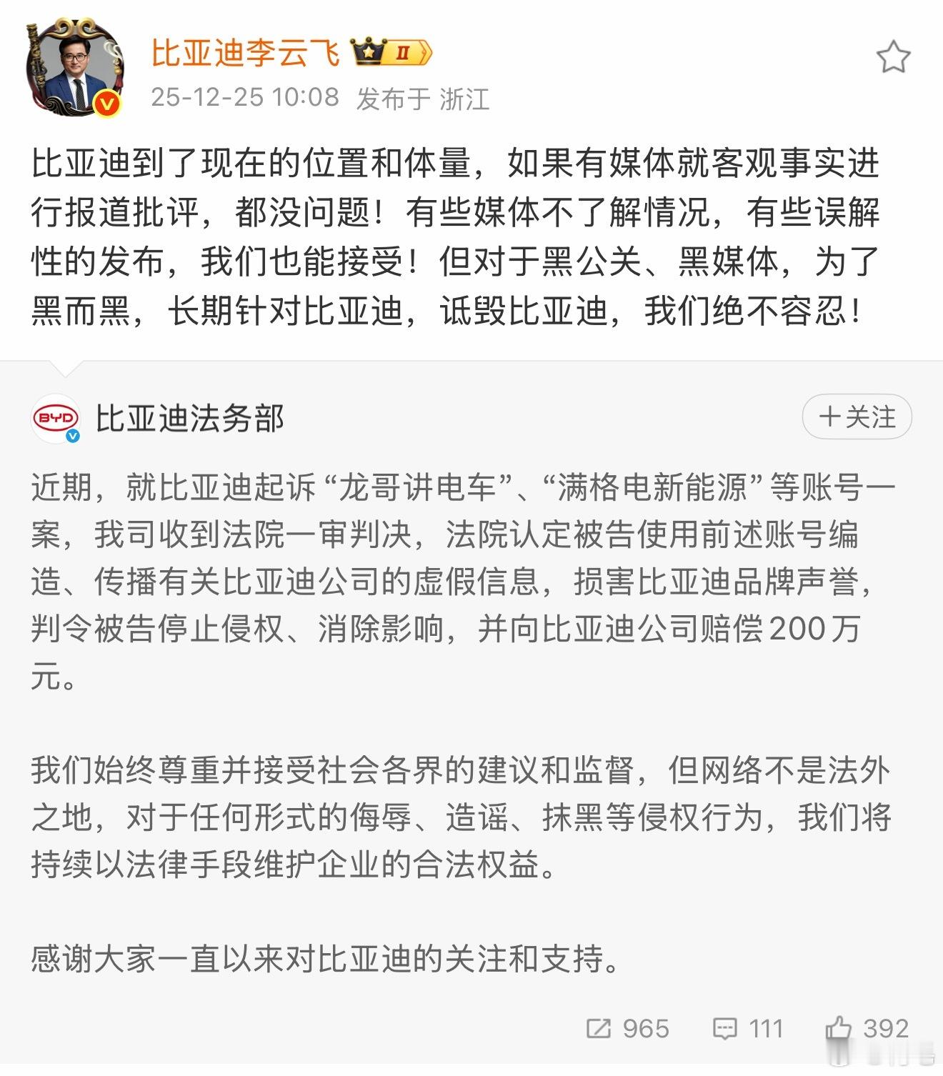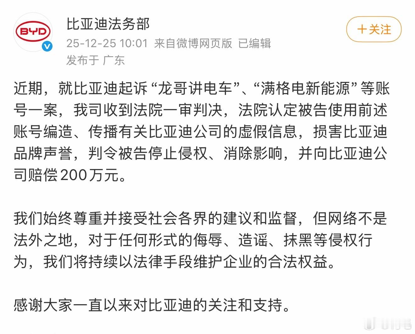 法院判决自媒体赔偿比亚迪200万元比亚迪起诉几个自媒体账号造谣抹黑的事儿出结果了~法院一审判决下来了,要求那几个账号停止侵权、消除影响,还得赔比亚迪200万元。简单说就是,有些账号长期编比亚迪的假消息,到处传播,这回法院认定确实是损害了企业声誉了。比亚迪那边态度也挺清楚:接受监督,接受批评,哪怕是误解也能沟通,但绝不接受为了黑而黑、故意造谣的黑公关。说实话,这几年新能源车行业是真火,话题也多,但有些人为了流量或者别的目的,就爱信口开河乱黑。车企专心搞技术、搞产品本来就不容易,还得腾出手来对付这些没影儿的谣言,确实挺耗神的。这次判下来,也算是给行业提了个醒:网络不是随便说话不负责的地方,尤其是做自媒体、搞内容,更得守住底线。企业用法律手段维权,既是对自己负责,其实也是在维护一个更清朗点的讨论环境。毕竟谁都不想好好看个车、聊个技术,满眼都是胡编乱造的消息。支持正当批评,反对恶意造谣,这事应该挺明白的。往后估计也会有更多企业较真起来,该告的告,该追责的追责。踏实搞技术的,不该被口水淹没了。话说回来,这事也提醒咱们普通网友:刷到特别耸动、没来源的消息,不妨多留个心,等等事实,别急着传。干净点的网络,对谁都好。