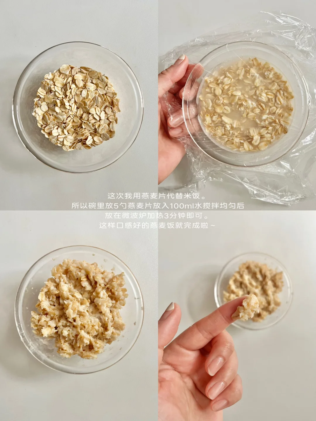 4.这次我用燕麦片代替米饭。所以碗里放5勺燕麦片放入100ml水搅拌均匀后放在微波炉加热3分钟即可。这样口感好的燕麦饭就完成啦~