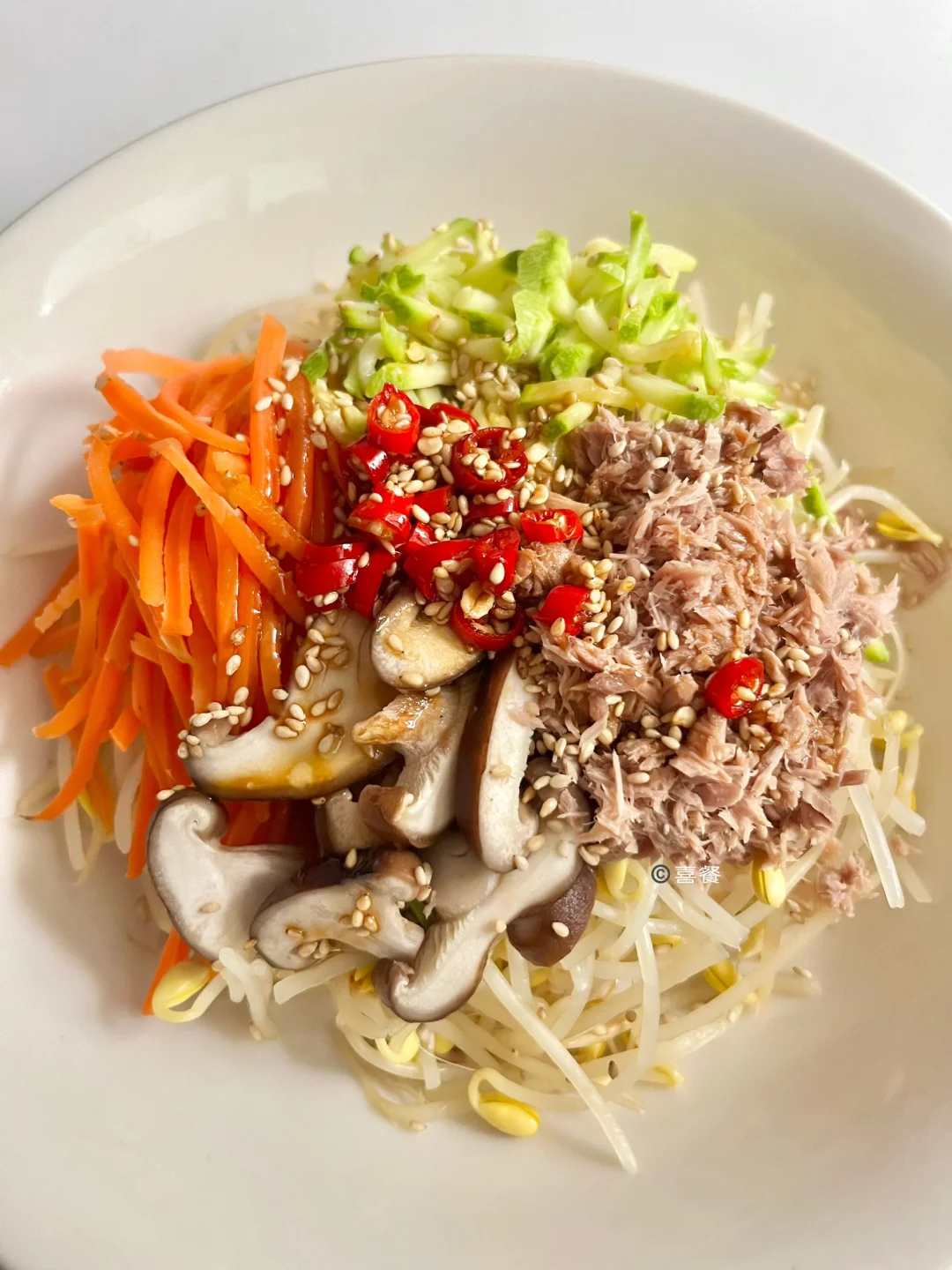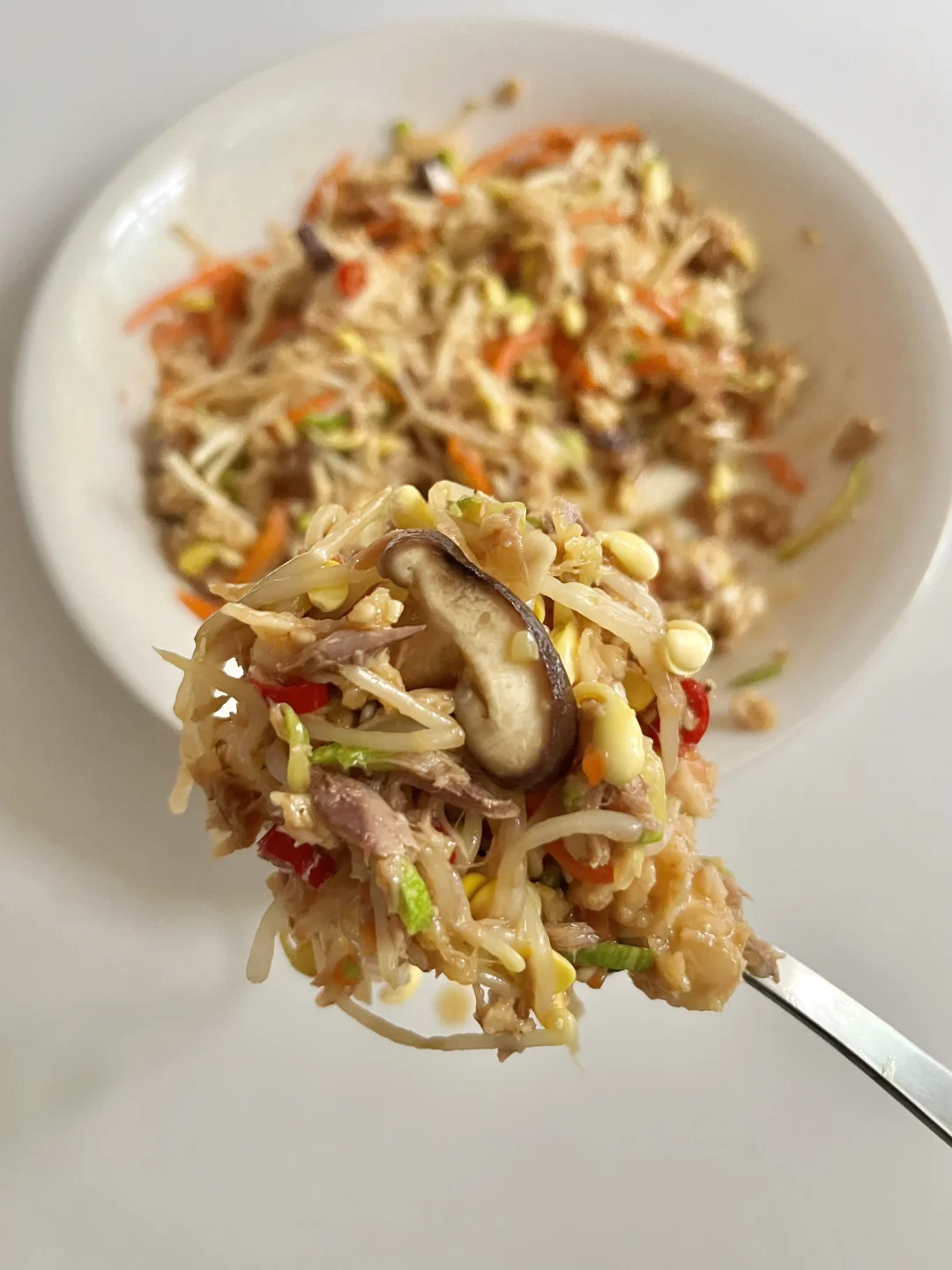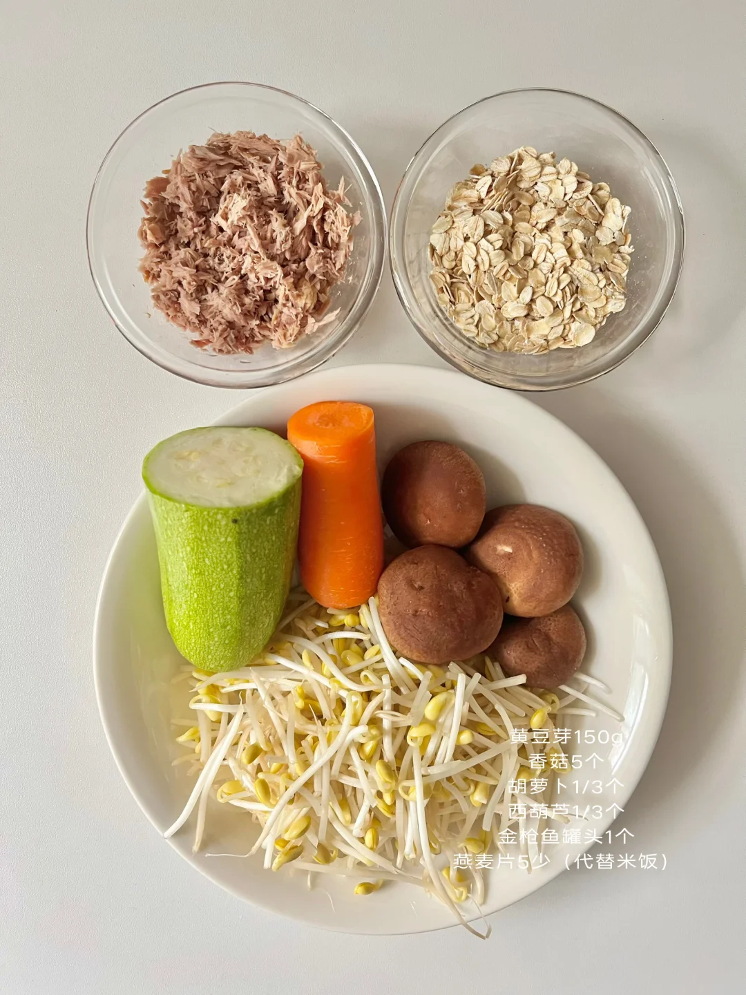 🥕食材:黄豆芽150g, 香菇5个,胡萝卜1/3个,西葫芦1/3个,金枪鱼罐头1个,燕麦片5少(代替米饭)