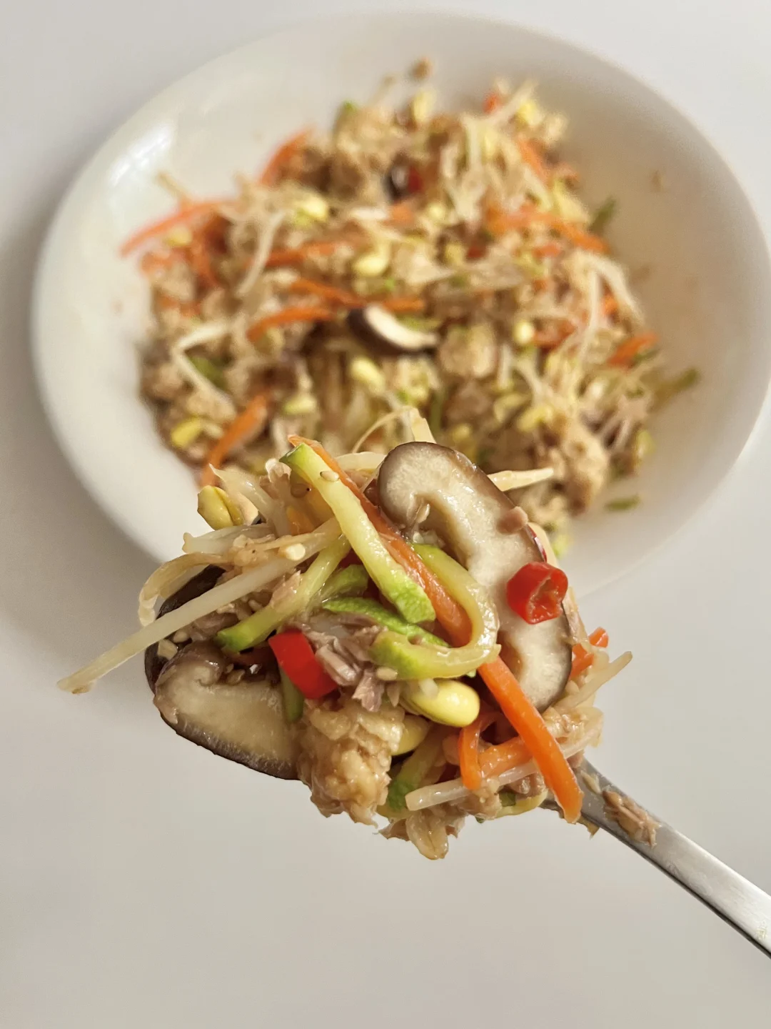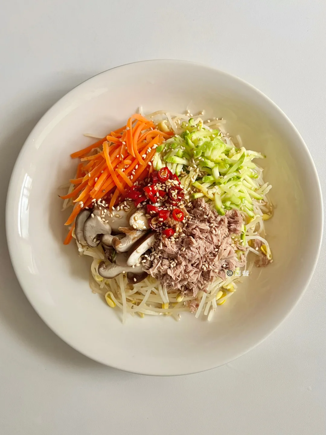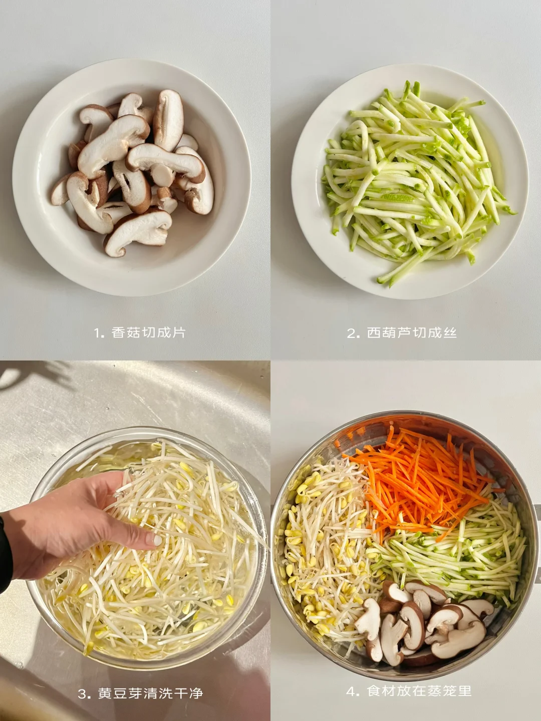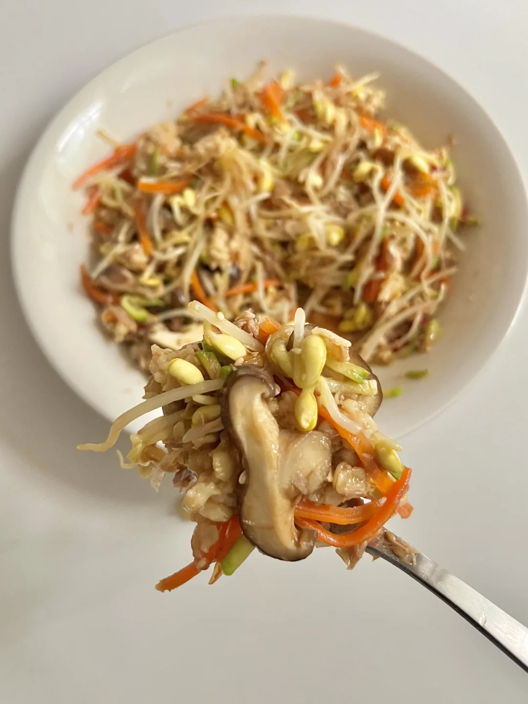 🥕食材:黄豆芽150g, 香菇5个,胡萝卜1/3个,西葫芦1/3个,金枪鱼罐头1个,燕麦片5少(代替米饭)