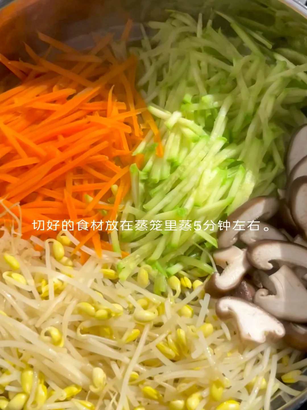 1.胡萝卜和西葫芦切成丝。香菇切成片,黄豆芽清洗干净备用。