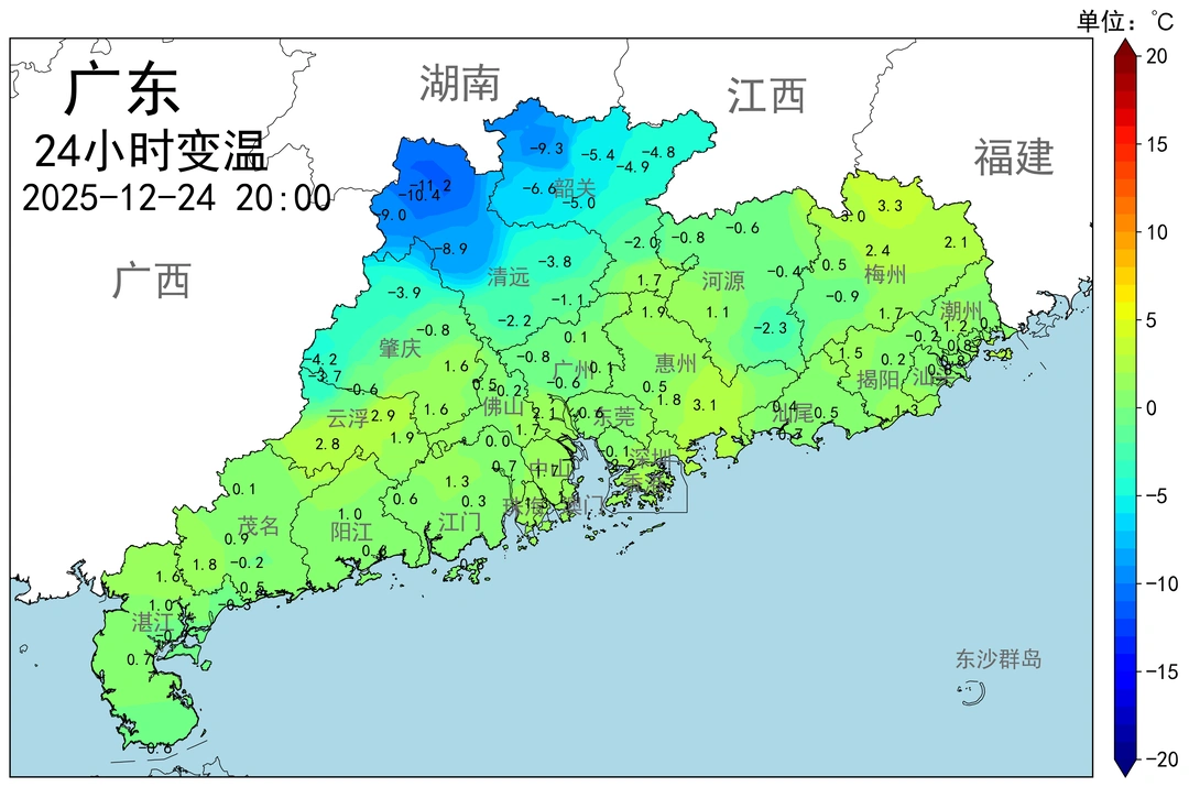 天气多变,真情不变。 截至今天(12月24日,周三)晚上8点,冷空气已经到达广东粤北地区,韶关北部,清远北部普遍出现了8-10度降温,局部降温超过10度。 随着冷空气不断南下,周四早上到达广东沿海。预估,广东今晚(周三晚)~周四(25日)将陆续有7-8度降温,局部降温10度。天气明显转冷,叠加4-6级东北风🌬️,外加阴雨🌧️,周四全省感觉“湿冷~阴冷”。⚠️请各位广东伙伴注意防寒保暖,周四当天注意带好雨具,以防阴雨突袭🌧️。 💣⚠️最冷将出现在周四晚上,周五早上,周五晚上,粤北最低温将跌破5度,沿海最低温将逼近10~11度(广州最低温将跌破10度),广东沿海地区第四次尝试入冬! 周五(26日)开始,广东天气逐步稳定,阴天转多云,阳光逐步增加。但气温依然低位徘徊,天气寒冷,注意保暖。 周六(27日)开始,广东全省多云转晴天🌞,气温开始止跌回升。预估,周六~周二(30日),全省晴天🌞,气温累计有7~8度回升(2度/天的速度回升),昼夜温差加大,早晚依然寒冷,中午相当暖和;天气相当干燥,⚠️注意保湿,防火🔥防静电。 31日~元旦假期期间,广东天气不太稳定,云量增多,转为多云天气,局部阴天有毛毛雨/小雨🌧️,气温略有3~4度的小波动,没有明显的强降温天气。由此看来,广东沿海2025年的入冬目标,只能看2026年的表现了。 ⚠️最后温馨提示: 忽冷忽热的多变天气,将削弱人体免疫力,出行注意带好口罩😷,防范流感,以最佳状态迎接2026年🫰🏻