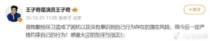 王子奇道歉 25日,八卦媒体曝光王子奇将烟头丢出车窗外。刚刚,发文道歉:“很抱歉给环卫造成了困扰以及没有意识到自己行为存在的潜在风险,我今后一定严格约束自己的行为!感谢大家的批评与指正! ”