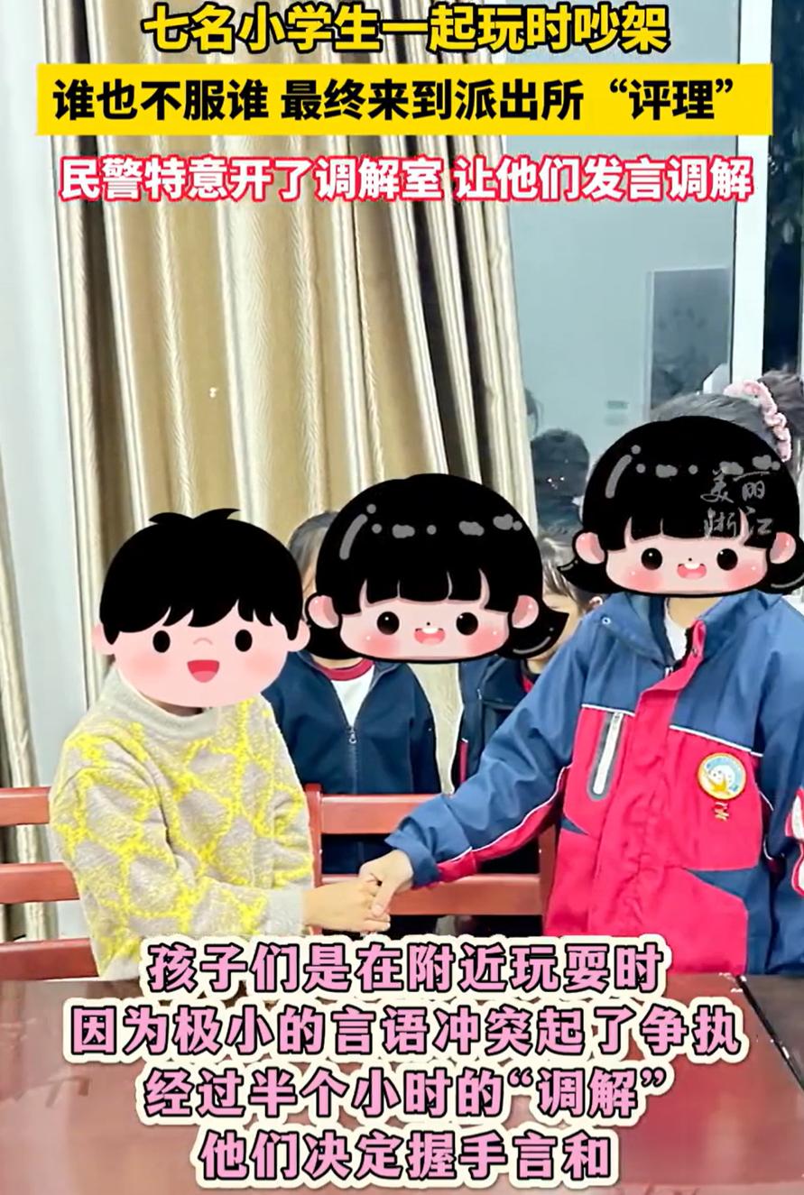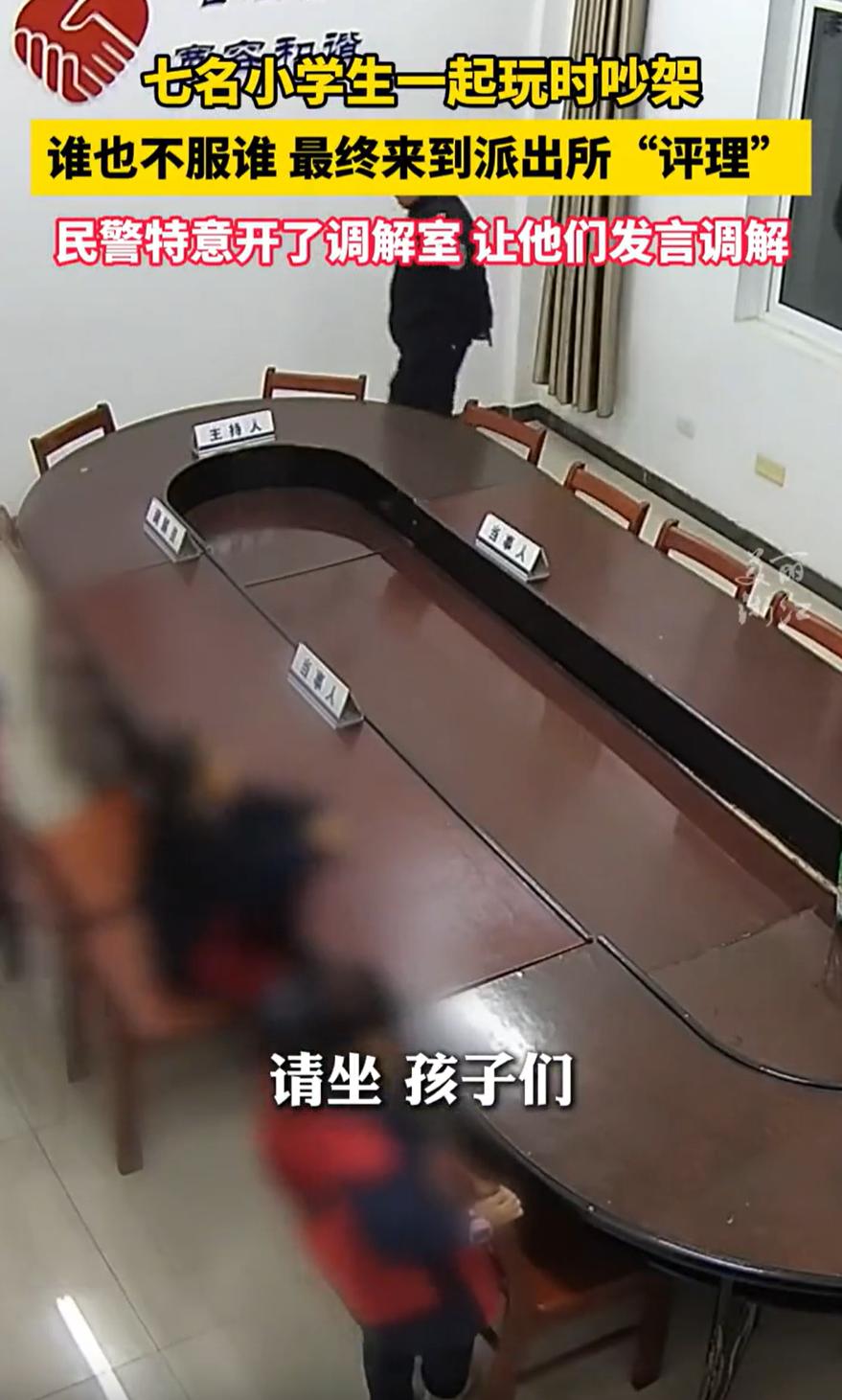 火到央视了!浙江丽水,七名小学生来到派出所,进门后民警以为他们是迷路走丢了,可一问才知道,他们是因为小事吵架,来派出所评理的,民警得知后并没有觉得是无理取闹,反而专门把调解室打开,让他们在里面发言调解,而这个事,更是直接被央视转发 原来他们在附近玩,因为一点小事吵起来,两边谁也不服谁,干脆就约好了一起找警察。这场景让值班民警笑了,但他没敷衍,转身就把调解室的门打开,请孩子们进去坐 他安排女生坐一边,男生坐另一边,像模像样地给他们主持。两边各自派出代表发言,你一言我一语,把事情的来龙去脉讲清楚。整个过程持续了大约半小时,最后孩子们握手言和,开开心心离开了派出所 这事后来被央视转发,许多网友看了既觉得可爱,又感到温暖。有人说现在孩子真厉害,懂得用正规渠道解决问题;更多人则称赞民警的耐心,没有因为他们是小孩就随便应付 其实我觉得,这件事虽然小,却让人看到一些很实在的东西 孩子们选择来派出所,说明他们心里相信警察,知道这里是讲道理的地方。这种信任不是凭空来的,一定是平时在生活中、在学校里,被大人教过,也被认真对待过,他们才知道“有矛盾找警察”不是一句空话 而民警的反应更是关键。他没有觉得这是小孩胡闹,也没有草草打发,而是郑重地打开调解室,给他们空间,听他们把话说完。这个举动传递给孩子的信号是:你们的矛盾是重要的,你们的声音是值得被听见的 这是一种很好的示范。孩子知道,讲理是有地方去的;规则不是只对大人开放;被认真对待,本身就是解决问题的一部分