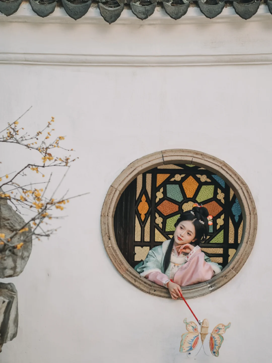 “落地长窗前,梅花随风摇曳,翠绿蕉色、留白粉墙作为陪衬。”