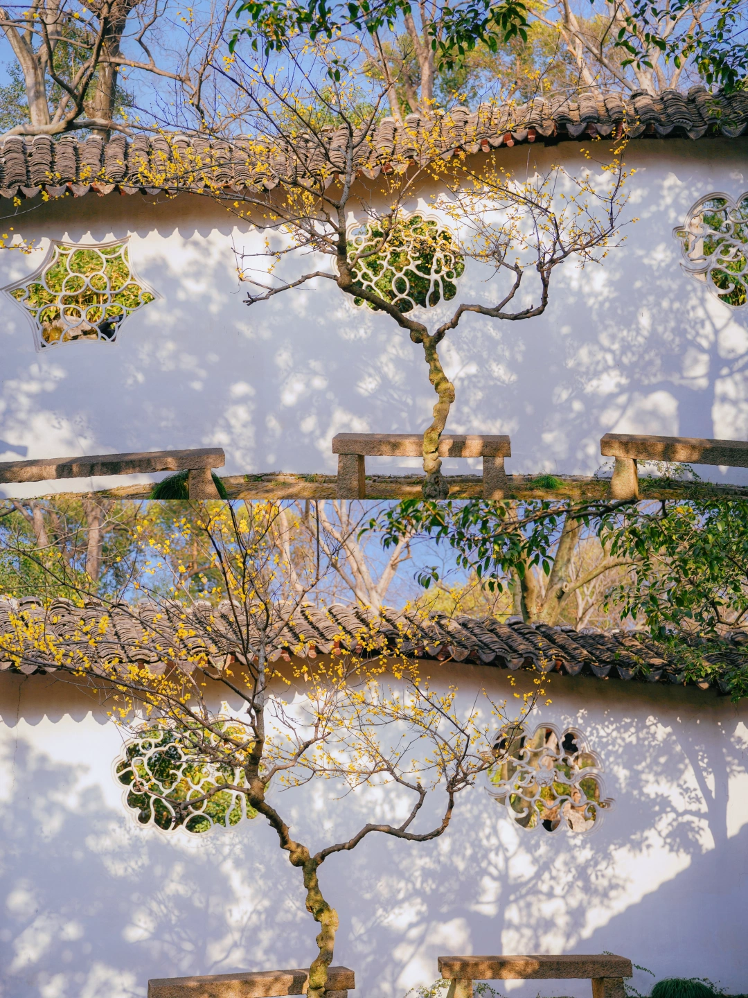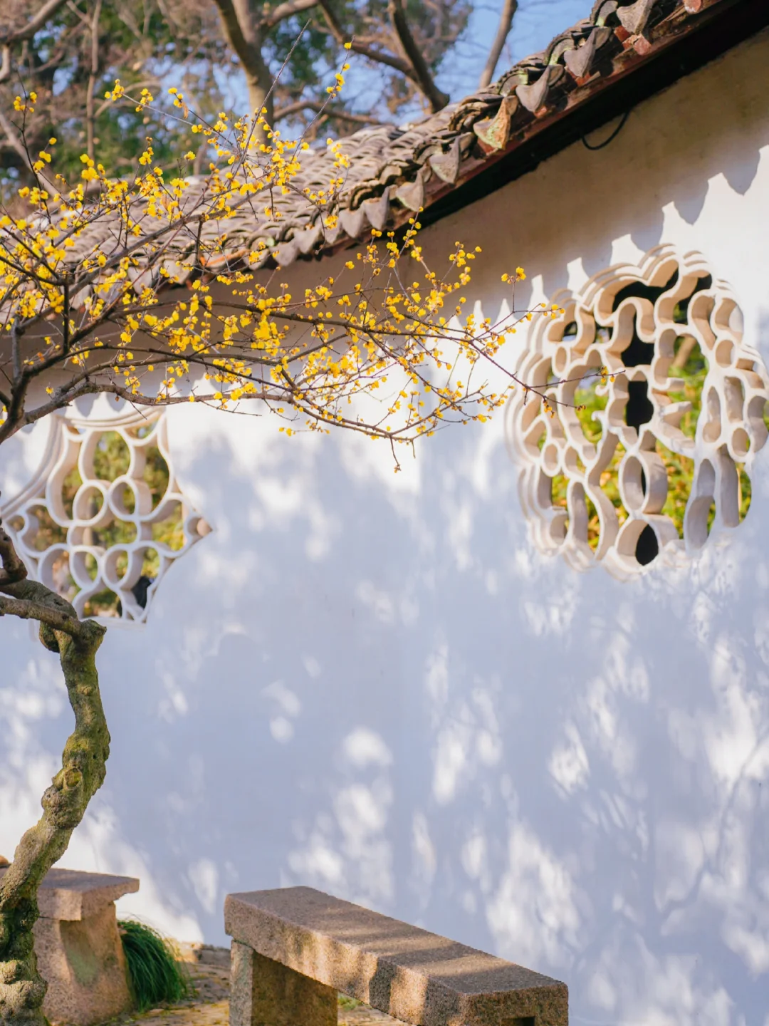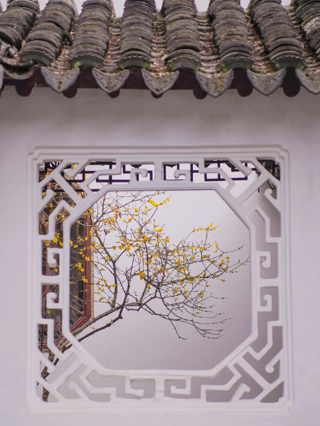“当蜡梅遇上苏州园林,缀满花朵的枝条衬在花窗之外,总能刚好形成一幅绝美的画面。”