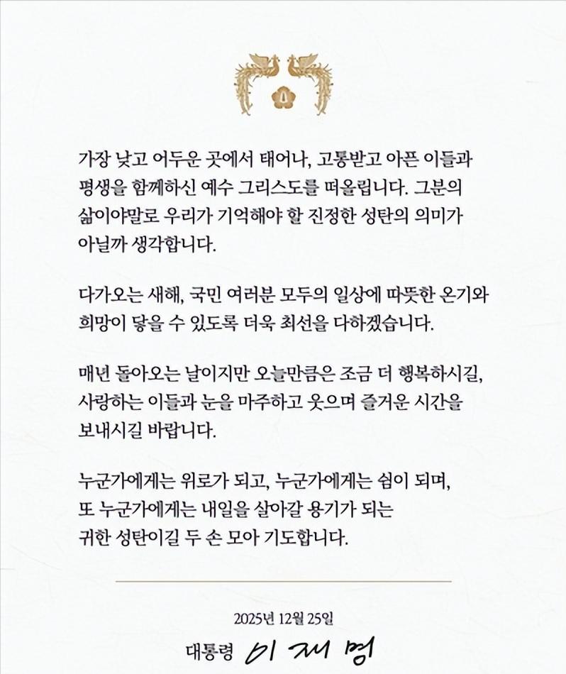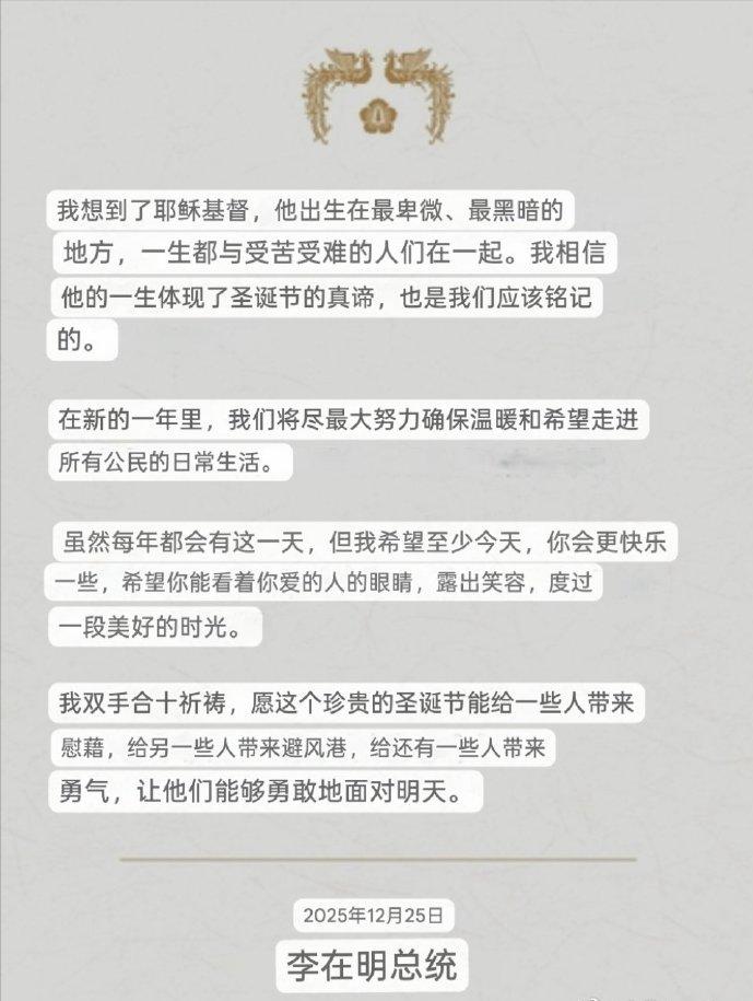 韩国总统李在明发文祝贺圣诞,作为基督教大国,耶稣可能真是韩国的[大笑][大笑]! 截至 2023-2024 年的统计,韩国基督徒占总人口的 30%-45%,其中基督新教约占 20%-30%,天主教约占 7%-11%。 这一比例不仅远超中日两国(均低于 2%),更使基督教成为韩国第一大宗教,超过佛教(约 17%)及其他传统信仰。 值得注意的是,12个全球信徒最多的基督教会组织中,有 11 个位于韩国,韩国也稳居全球第二大基督教传教士输出国(仅次于美国)。 基督教在韩国的兴起与民族命运深度绑定。1784 年由朝鲜使臣后裔自中国引入,1919 年 “三一独立运动” 的核心领导者中,16 人是基督徒,教会也因此成为殖民当局镇压的重点目标。 这种 “信仰与救国” 的联结,使其从外来宗教转化为韩国民族认同的一部分。 圣诞节在韩国是法定公休日(被称为 “红日子”), 且庆祝氛围兼具宗教仪式与世俗狂欢的双重特征。 根据 2025 年韩国官方假日清单,12 月 25 日圣诞节当天为全国法定假日,政府机构、学校、银行等均停业,多数企业也会放假休整。 若节日恰逢周末部分单位会补假,但核心放假日期固定为 12 月 25 日。 圣诞节当天,基督徒群体多会参与教堂礼拜、子夜弥撒等宗教活动, 而对普通民众而言,圣诞节更偏向世俗节日,年轻人会交换礼物、装饰圣诞树,情侣们则将其视为浪漫约会日,商圈、餐厅也会推出主题活动,形成全民参与的狂欢氛围。 韩国圣诞节的独特之处在于 “宗教仪式与商业狂欢并存”,使其成为仅次于新年、秋夕的重要节日。 这种 “高信仰比例 + 法定假日” 的组合,使韩国成为东亚地区圣诞节氛围最浓厚的国家之一。