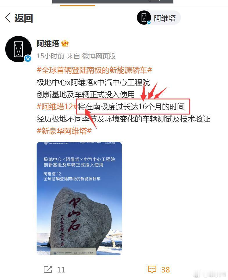 12月到达南极,而这个时候南半球正是夏天,南极的温度也就是零下1度的样子,有人就质疑“阿维塔在最热的时候搞南极测试”,是噱头。但实际上呢,他压根就没看懂这句话,这台阿维塔12将在南极渡过16个月,一年半的时间,肯定要经历南半球的寒冬了,等到明年6月份,那才是真正的考验。可不是说现在就已经做完零下50摄氏度的测试了,有的人真就是断章取义。换个角度看,这种质疑声合理吗?我觉得是没问题的,人们已经在舆论场上见识的多了,对于车企的宣传营销都多了一分警觉,这是好事。而对于阿维塔来说,踏踏实实做好每一项测试,把数据和经验用到新产品的改良与研发上,那就是很OK的事情了。阿维塔官方回应南极之旅争议中国新能源汽车将进行16个月极地测试