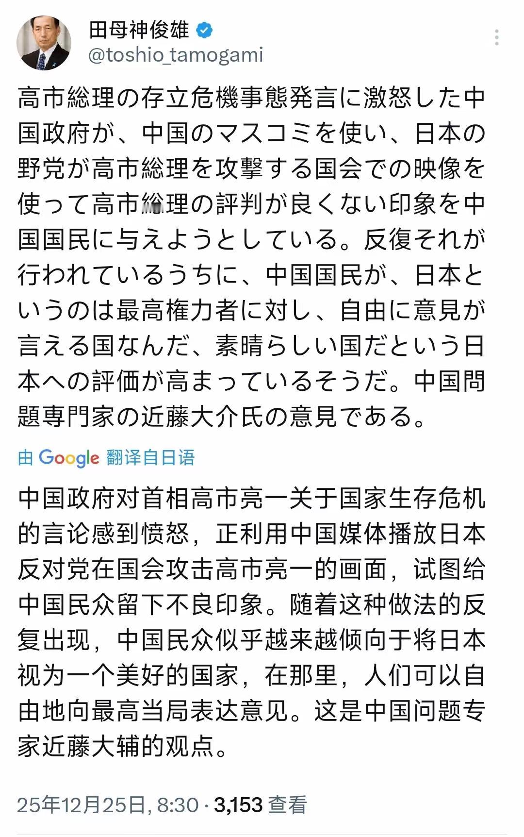 最近,日本航空自卫队前参谋长田母神俊雄跳的极高,处处显摆刷存在感。 12月25日,他再次发文称:“中国对高市首相关于国家生存危机的言论感到愤怒,正利用媒体播放日本国内反对高市早苗的画面,试图留下不良印象。中国民众似乎越来越倾向于将日本视为一个美好的国家。” 他的言论完全是黑白不分,若论说谎的本领,简直无人能比,明知事是错误的,却还大言不惭,说的有鼻子有眼,歪理终究是歪理,根本站不住脚。 高市早苗发表错误言论后,日本一些右翼分子跟着教唆挑衅,严重干涉我国内政,却还“理直气壮”。 对于错误行径,不但不从自身找原因,却再三在语言上挑衅,在行动上抹黑,任何的挑衅都掩盖不了日本妄图突破和平宪法,加强军事扩张的意图,在周边国家制造紧张气氛,严重破坏地区和平稳定。 日本的挑衅行为,已经激起了中国人民和世界上爱好和平人士的强烈愤慨,包括日本民众都已经看不下去了,谁都不愿意看到的结果却被高市之流破坏殆尽。 日本是一个服硬不服软的国家,你和他讲道理,他转移话题;你和他谈正义,他假装看不见;你和他和和气气,他和你气势汹汹。所以,当有一天重拳过去,看你老不老实。