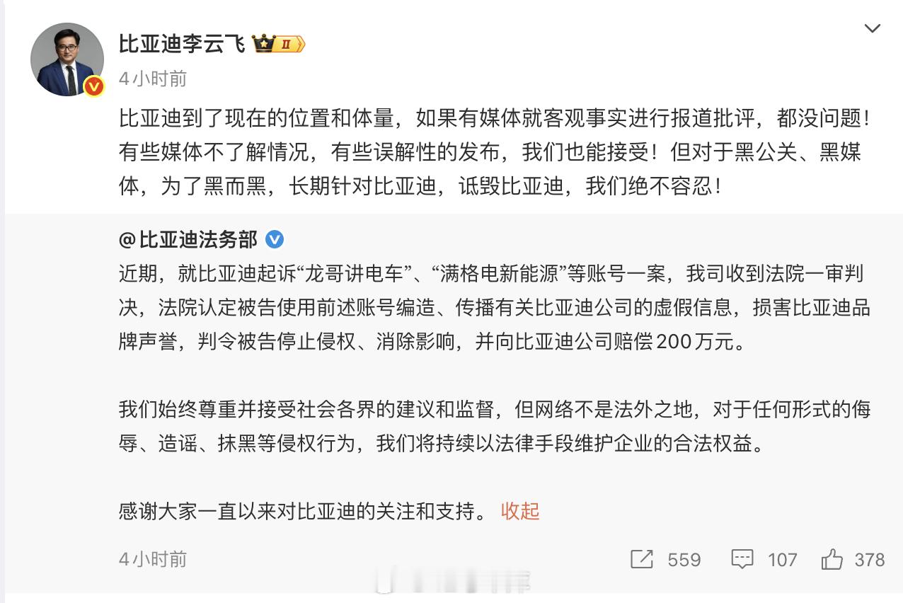 法院判决自媒体赔偿比亚迪200万元比亚迪的法务部一直在行动,比亚迪公关处总经理
