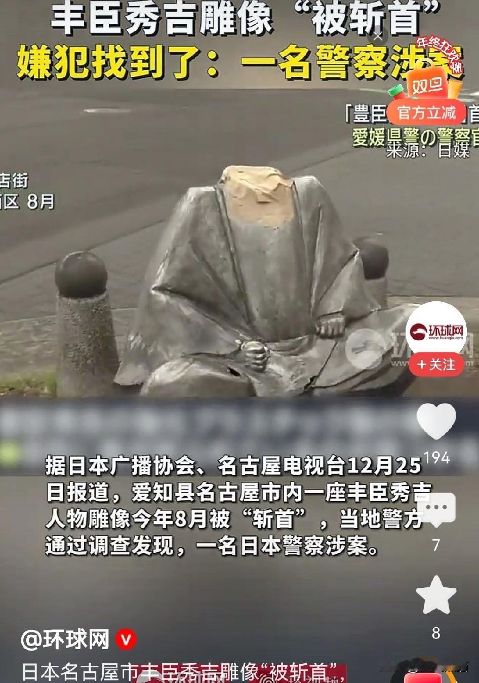 突发,日本某名将的雕像“被斩首”, 看来行动真的开始了, 日本名臣丰臣秀吉的雕像“被斩首”,这个是日本历史上的一个重要人物,虽然出身贫寒,但经过自己的智慧和勇敢,让散乱的日本形成了政治统一。 丰臣秀吉在明朝时期多次侵犯朝鲜,多数被明朝和朝鲜的联军击败,至此,日本吞并朝鲜的野心被打击的粉碎。 如今,丰臣秀吉的雕像“被斩首”,看来也是顺应了天意。