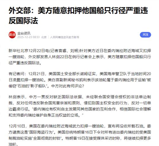 针对美方在公海悍然扣押中国油轮的挑衅行为,外交部发言人林剑在记者会上强硬表态:若美方拒不归还被劫物资,中方必将采取强有力反制措施。 近日,美国在公海上,把人家委内瑞拉的油轮给扣了,还不是一次,是一桩接着一桩。他们自己说的理由是制裁,但这做法在国际上炸了锅,很多国家觉得这跟海盗行为没什么两样。 从12月10号扣下第一艘“船长号”油轮开始,美方在加勒比海就没闲着,短短十天不到就接连动手,甚至把主意打到了和中国相关的船只头上,彻底把公海当成了自己家的后花园。 更过分的是12月20号凌晨那起操作,美国海岸警卫队直接出动武装直升机,在加勒比海公海上对一艘悬挂巴拿马国旗的油轮动手。 这艘名叫“世纪号”的超级油轮,看着挂着巴拿马旗,实际运营方是中国香港的公司,船上装载的180万桶原油早就被中国买家全款买下,妥妥的中国资产。 美军特战队员速降登船,几分钟内就切断了船只所有对外通信,连给船旗国巴拿马打声招呼的环节都省了,全程没有出示任何搜查令和法院文件,活脱脱一场光天化日之下的海上抢劫。 美方事后给出的理由是“涉及委内瑞拉受制裁石油”,可这套说辞根本站不住脚。联合国国际海事组织早就公开确认,“世纪号”及其运营公司压根不在任何美国制裁名单上,中委之间的能源贸易是完全合法的互利合作,轮不到第三方指手画脚。 而且按照《联合国海洋法公约》,公海上的船只受国际法保护,美方这种未经授权就动用武力扣押他国船只的行为,本质就是突破规则的霸权行径,和海盗没区别只是多了层“国家行为”的遮羞布。 面对美方的蛮横行径,外交部发言人林剑在12月22号的记者会上直接亮明立场,不仅严厉谴责美方违反国际法的单边霸凌行径,更放出狠话,若美方拒不归还被劫物资,中方必将采取强有力反制措施。 这可不是空喊口号的警告,毕竟32年前“银河号”事件的屈辱,中国早就刻在了心里,如今国力和国际话语权早已今非昔比,自然不会任由美方肆意拿捏。 说到底美方频繁扣船根本不是为了所谓的制裁,核心就是盯着委内瑞拉的石油资源,还想借机切断中委之间的能源合作。 委内瑞拉有着全球最大的石油储量,却一直不愿受美方摆布,还和中国搞起了“石油换贷款”的合作模式,如今对华原油出口占比已经达到85%,更关键的是双方60%的交易都用人民币结算。 这直接触动了美国的命根子——石油美元体系,毕竟全球石油交易长期用美元结算,才是美方霸权的重要基石。 为了达成目的,美方也是下了血本,不仅在加勒比海部署了11艘军舰,还派出“福特”号航母战斗群和1.5万兵力,甚至让战斗机抵近委内瑞拉首都附近空域施压,摆出一副随时要动武的架势。 可这套高压手段并没有达到预期效果,委内瑞拉总统马杜罗直接硬刚,明确表示不会成为任何国家的殖民地,伊朗等国也站出来表态要和委内瑞拉深化合作,就连一些西方国家都看不下去,悄悄暂停了和美方在拉美地区的情报共享,用实际行动表达不满。 美方大概以为靠武力就能吓住所有人,却忘了中国早就不是任人拿捏的软柿子。中方不仅会在法理上联合巴拿马、委内瑞拉等国向国际组织提诉,曝光美方违法证据,更有足够的经济和外交手段反制。 一旦中方启动对等反制,那些参与扣押行动的美企、机构都将付出代价,而中方扩大能源贸易人民币结算的步伐,只会因为美方的挑衅更加坚定。 美方的如意算盘其实打得很精,想靠扣船逼委内瑞拉妥协,想切断中国的能源通道,还想维护石油美元霸权。 可现实是这种无视规则的霸权行径只会让更多国家看清美方真面目,反而加速其霸权崩塌。中方的反制警告已经发出,接下来就看美方要不要硬扛,毕竟真闹起来,美方未必能占到便宜,反而可能赔了夫人又折兵,落得个众叛亲离的下场。