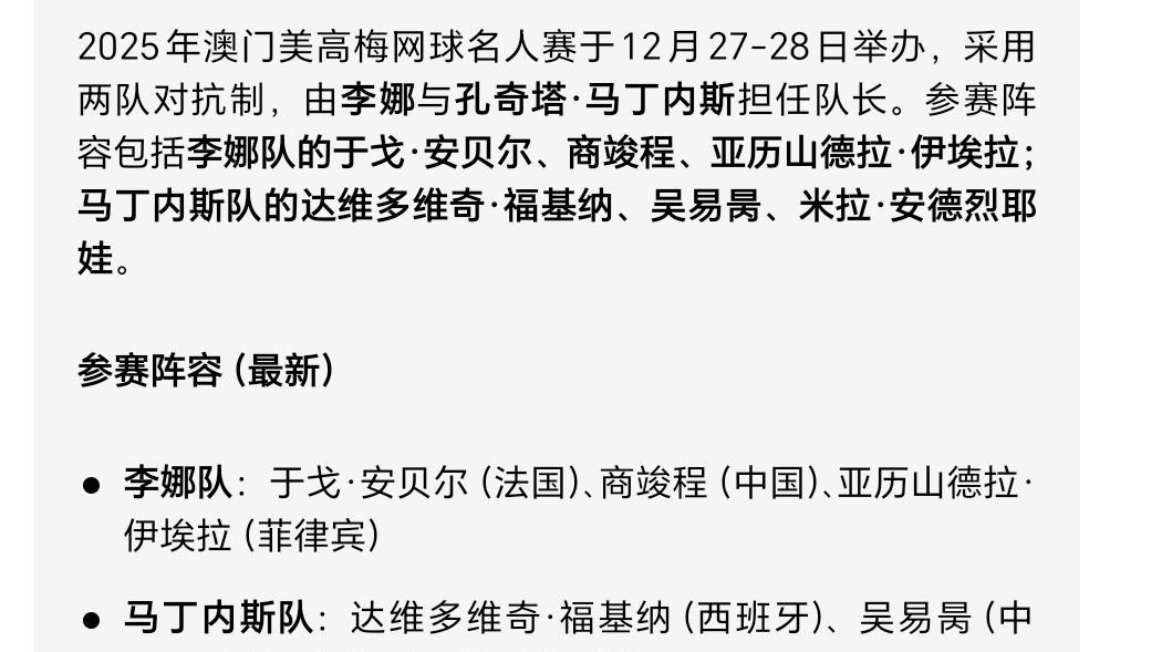 郑钦文缺席了李娜领衔的美高梅澳门名人赛!李娜和小米辣安德列娃的师傅马丁内斯分别领衔美高梅澳门名人赛的两队队长,小米辣安德列娃义无反顾来给师傅马丁内斯助阵,而李娜这边有中国球员商竣程和菲律宾小将埃拉,可惜郑钦文并没有助阵李娜,澳门名人赛将于本月27—28日进行举行,两队除了队长都是大满贯冠军之外,名气最大的就是小米辣安德列娃了。