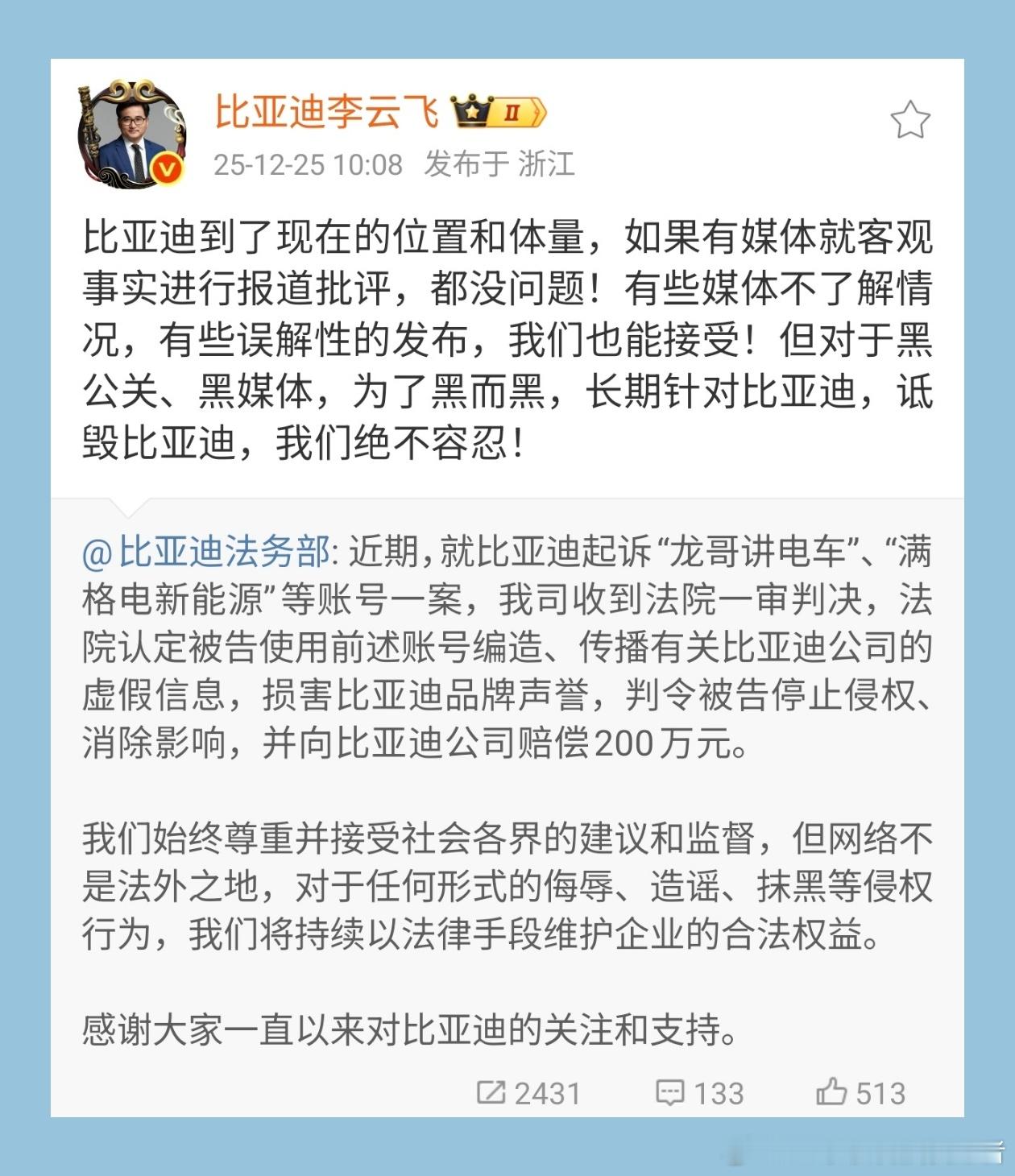 仔细聊一下比亚迪起诉“龙哥讲电车”、“满格电新能源”这件事。根据法院的一审判决结果,这位被告通过账号编造、传播针对比亚迪的虚假信息,损害比亚迪品牌声誉,判令其停止侵权、消除影响,并向比亚迪公司赔偿200万元。看到这个数字是不是挺意外的,很多人没了解过怎么突然赔偿这么多?其实看了他以前的直播就知道,自己是口无遮拦,虽然是技术出身,也是修车的,但主观情绪过于浓厚,经常发表一些极端言论,被起诉只能说是咎由自取。打着为网友好的口号,却做着严重损害汽车品牌的事,这不是正当行为。不止比亚迪起诉,他还被好几家车企起诉。而比亚迪这也是捍卫品牌正当权益的做法。一次两次也就罢了,就像李云飞总说的那样,可以接受批评,也可以理解那些不明真相的,但面对长期抹黑的人是不能容忍的。希望汽车行业以后能越来越清净,让这样的人少一些。