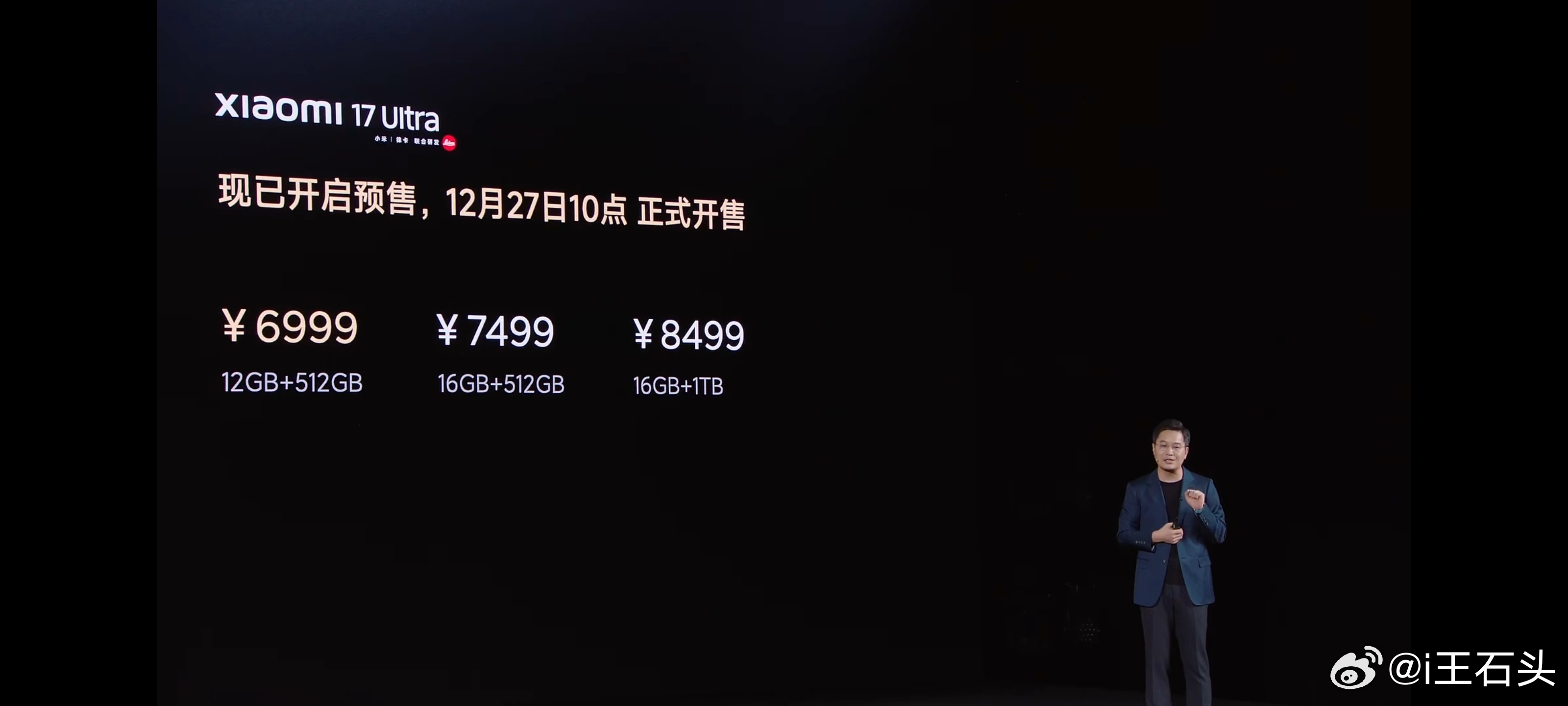 小米17 Ultra涨价了,6999元起售,但内存从256提升到了512。还有16+512和16+1TB版本,分别是7499元和8499元。小米发布会