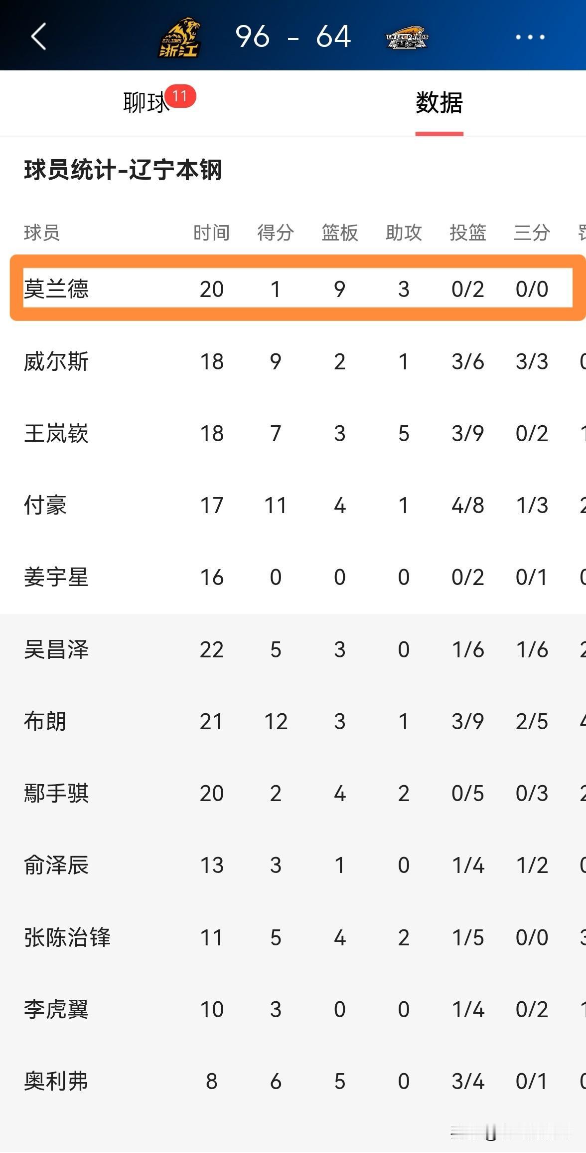 辽宁本钢外援莫兰德真是出工不出力!在今天辽宁本钢客场以64:96惨败于浙江方兴渡的比赛中,莫兰特首发出战20分钟,投篮2中0,其中罚球2中1仅仅得到1分,还出现了3次失误和3次犯规,他的场上正负值为-14。作为球队的攻防核心,此役莫兰德在攻防两端都毫无侵略性,他在场上显得非常懈怠,并没有展现出赢球的欲望。