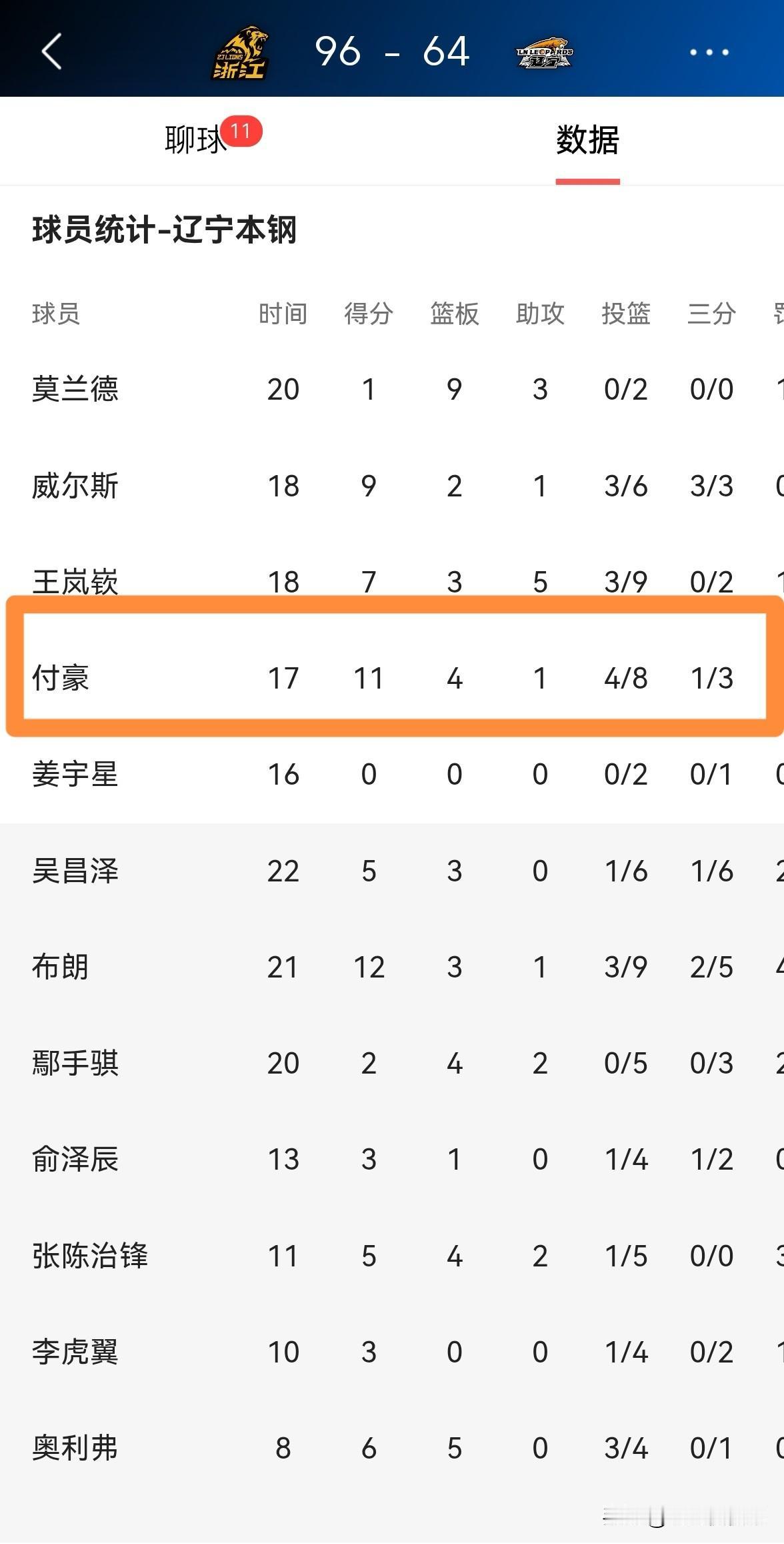 辽宁本钢大将付豪真是独木难支!虽然今天辽宁本钢在客场以64:96惨败于浙江方兴渡,但是付豪的整体表现还是非常不错的,只可以付豪独木难支无力回天。 全场比赛下来,付豪首发出战17分钟,投篮8中4,其中三分球3中1、罚球2中2得到11分4篮板,他的场上正负值为-17。