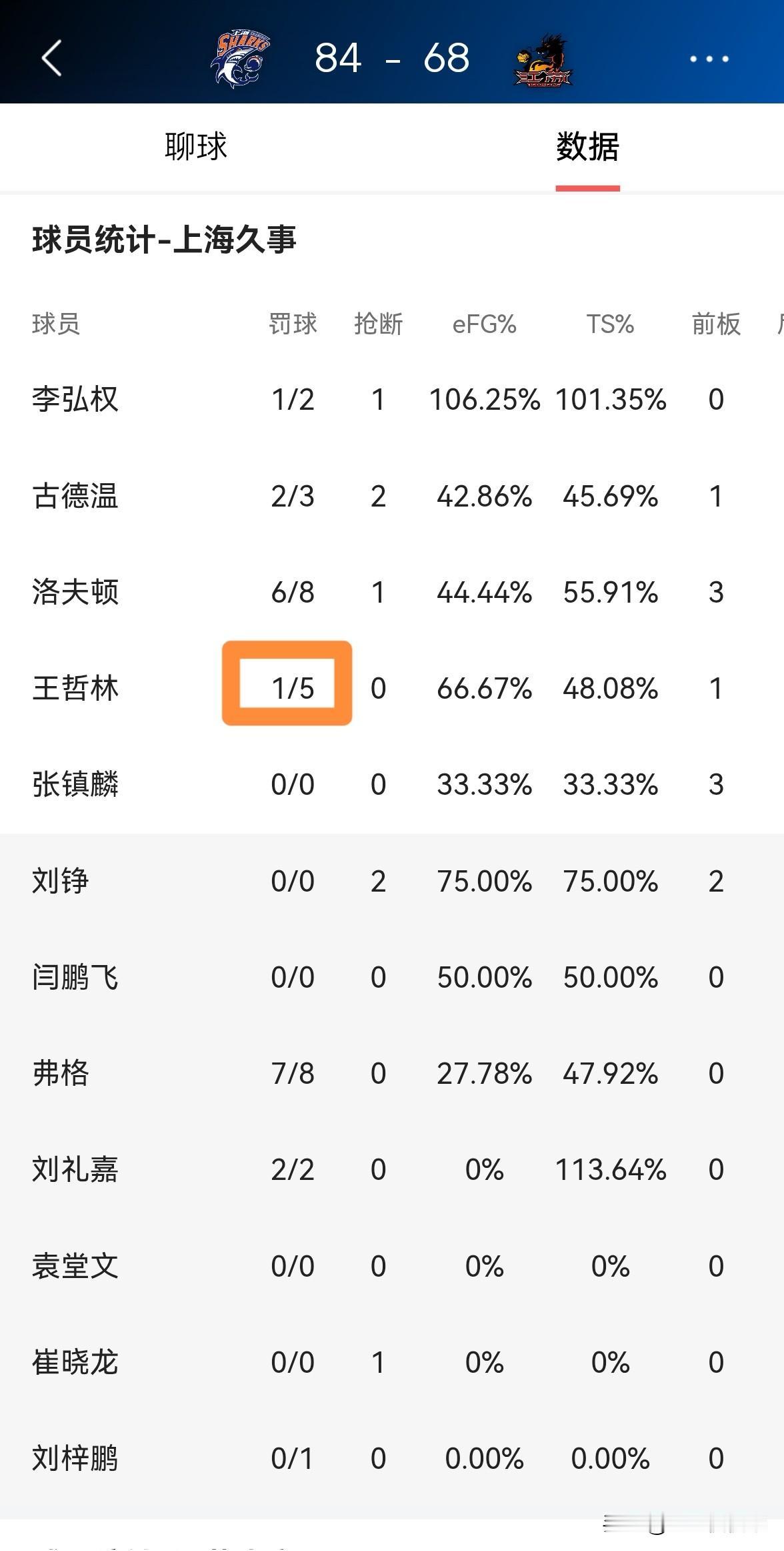 谁能拯救一下上海久事中锋王哲林的罚球?在今天上海久事主场以84:68轻取江苏肯帝亚的比赛中,王哲林的罚球真是一塌糊涂。全场比赛下来,王哲林首发出战15分钟,投篮3中2,其中罚球5中1得到5分6篮板,他的场上正负值为+5。 作为上海久事的当家中锋,王哲林的罚球真是太糟糕了,他必须提升自己的罚球命中率才行。
