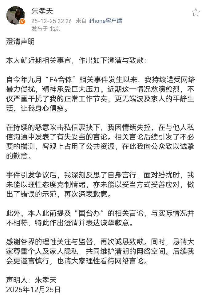 朱孝天发文道歉了,说自己被网暴了,在恶意言论的裹挟下,情绪失控,才胡言乱语的。 朱孝天澄清声明