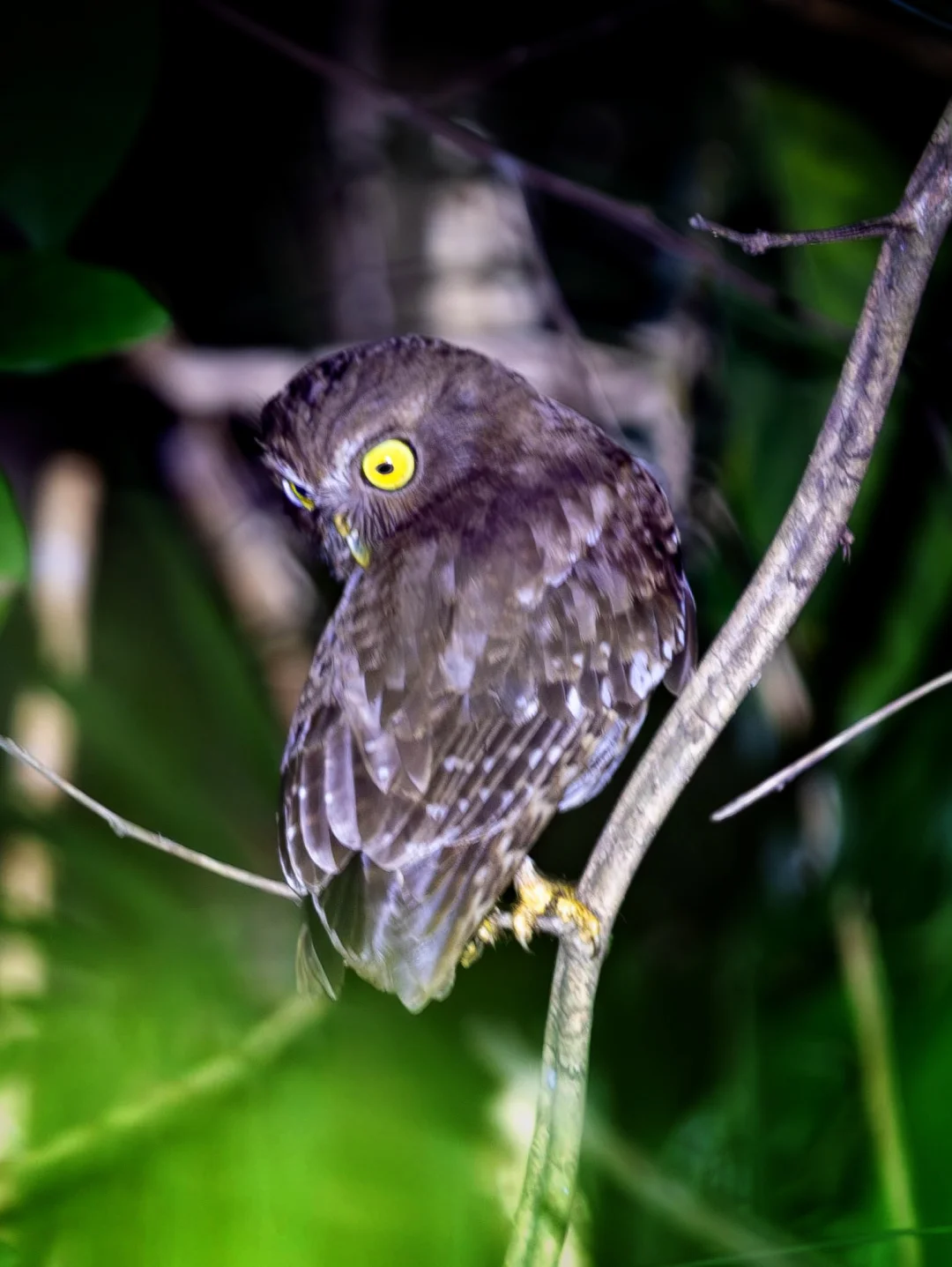 原创拍摄于2025.03 菲律宾鹰鸮,Luzon Boobook,鸮形目鸱鸮科鹰鸮属,菲律宾特有种,是菲律宾的标志性物种。 菲律宾鹰鸮是一种较小的猫头鹰,一般来说我认为鹰鸮看上去都瘦瘦小小的,没想到可能是角度问题吧,拍到的这只感觉胖胖呆呆的,看上去有一种惊恐的呆萌感。 目前看来线上现在对菲律宾鹰鸮的记录和研究资料都不是很多,希望能够在分布地种群维持住吧。