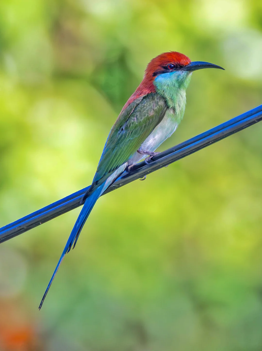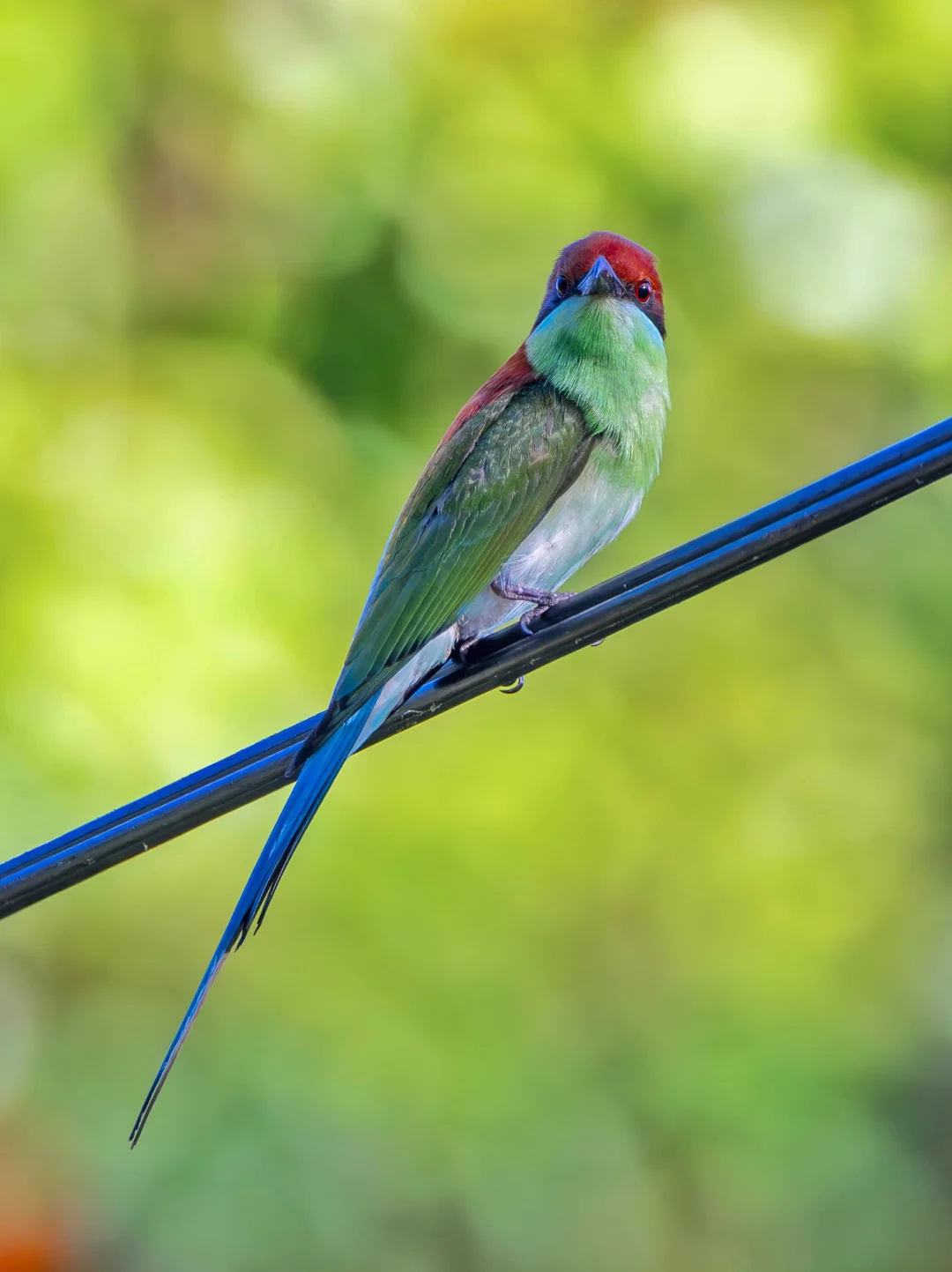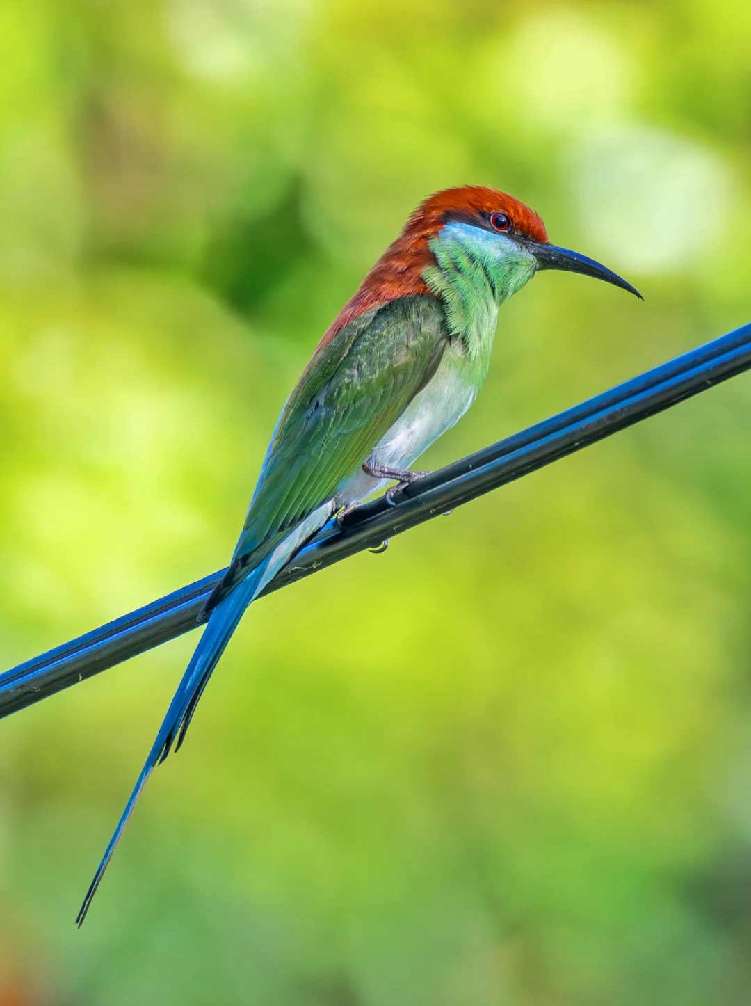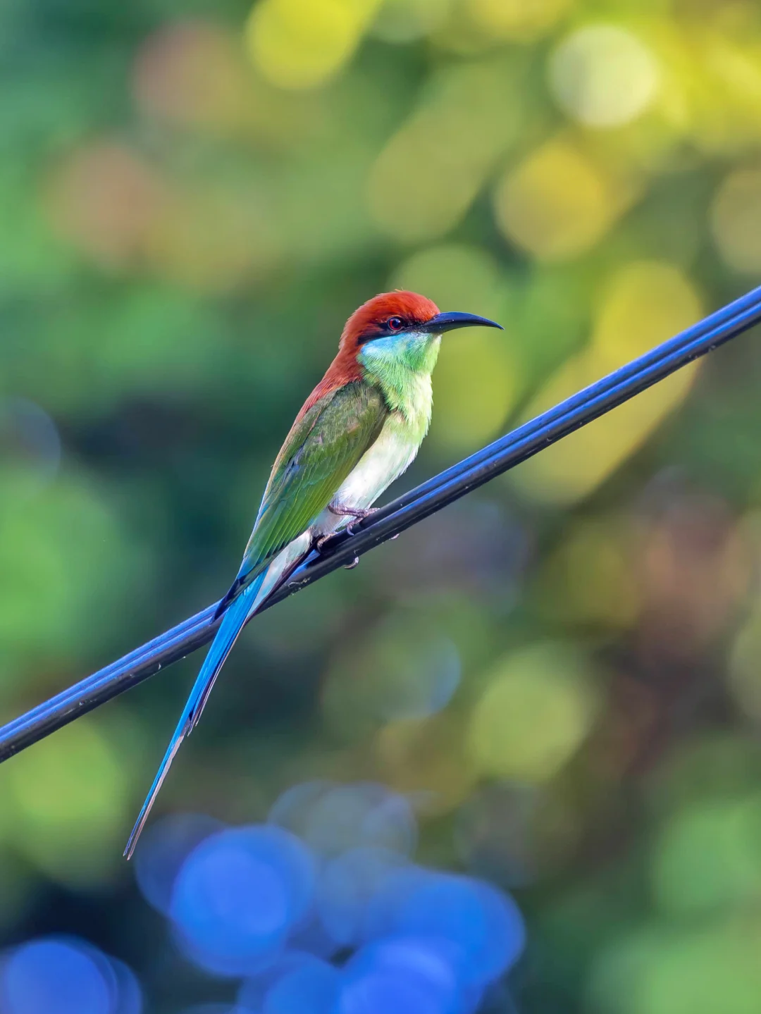 原创拍摄于2025.03 棕冠蜂虎,Rufous-crowned Bee-eater,佛法僧目蜂虎科蜂虎属。棕冠蜂虎原来被认为是蓝喉蜂虎的亚种,但是在2014年被确认为独立物种。他们目前只分布在菲律宾。 和我们常见的蓝喉蜂虎相比,棕冠蜂虎棕红色头冠和背部更加明显鲜艳,但是喉部颜色比较浅,没有蓝喉蜂虎那么蓝。尾羽中央也是延长的,整体蓝绿色彩搭配。 这是我第二次见到棕冠蜂虎,上一次是在棉兰老岛,这次是在吕宋。没想到这次还挺亲近,可以看清这么漂亮的小鸟啦。