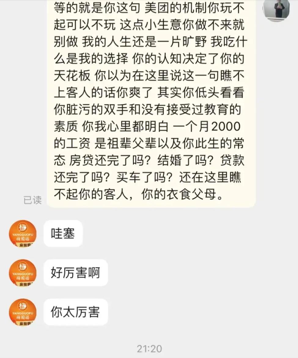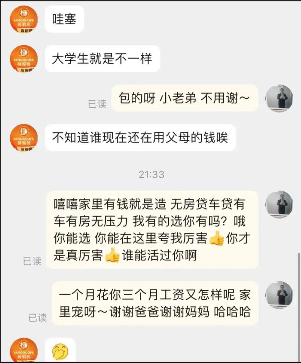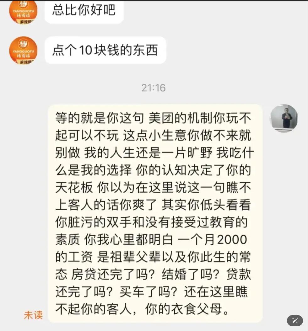 一块豆腐引发的“人生攻击”:大学生骂月薪2000的店主脏手,反遭全网嘲讽! 就因为外卖麻辣烫里的豆腐缺了个角,一位大学生和商家吵上了热搜!😤 本来事儿不大——豆腐可能是打包时碰坏了,商家也赶紧解释。 可这位同学火气噌就上来了,连发一串问号:“被人咬过吗?你这什么态度!” 商家回了一句“谁会咬你豆腐”,他直接炸毛开骂:“菜恶心人更恶心!你这辈子吃不上两菜一汤!” 好家伙,商家也没忍住:“总比你强,点个十块钱的东西嘚瑟啥?” 这句话彻底点燃战火!大学生开始疯狂输出“人生 superiority”: “我的人生是旷野,而你双手脏污没文化!” “我起点是你终点,你月薪2000我随便花!” 还自称有房有车无压力,狂踩对方是“底层打工人”。 他本来想发聊天记录让大家一起骂商家,结果评论区翻车翻得彻底!🙊 网友几乎一边倒: “书读得多就可以看不起人?” “真正的高认知是尊重,不是贬低!” “你这么牛还点麻辣烫?米其林不适合你吗?” 要我说,真别把学历当令箭,素质纔是硬通行证。 嘴上谈认知、格局,行为却暴露了真正的狭隘。 靠双手吃饭的人,比靠爹妈炫耀的人,值得尊重一百倍! 💬结语: 你可以选择吃什么,但没资格鄙视为你做饭的人。 社会现象 高学历不等于高素质 尊重每一份工作