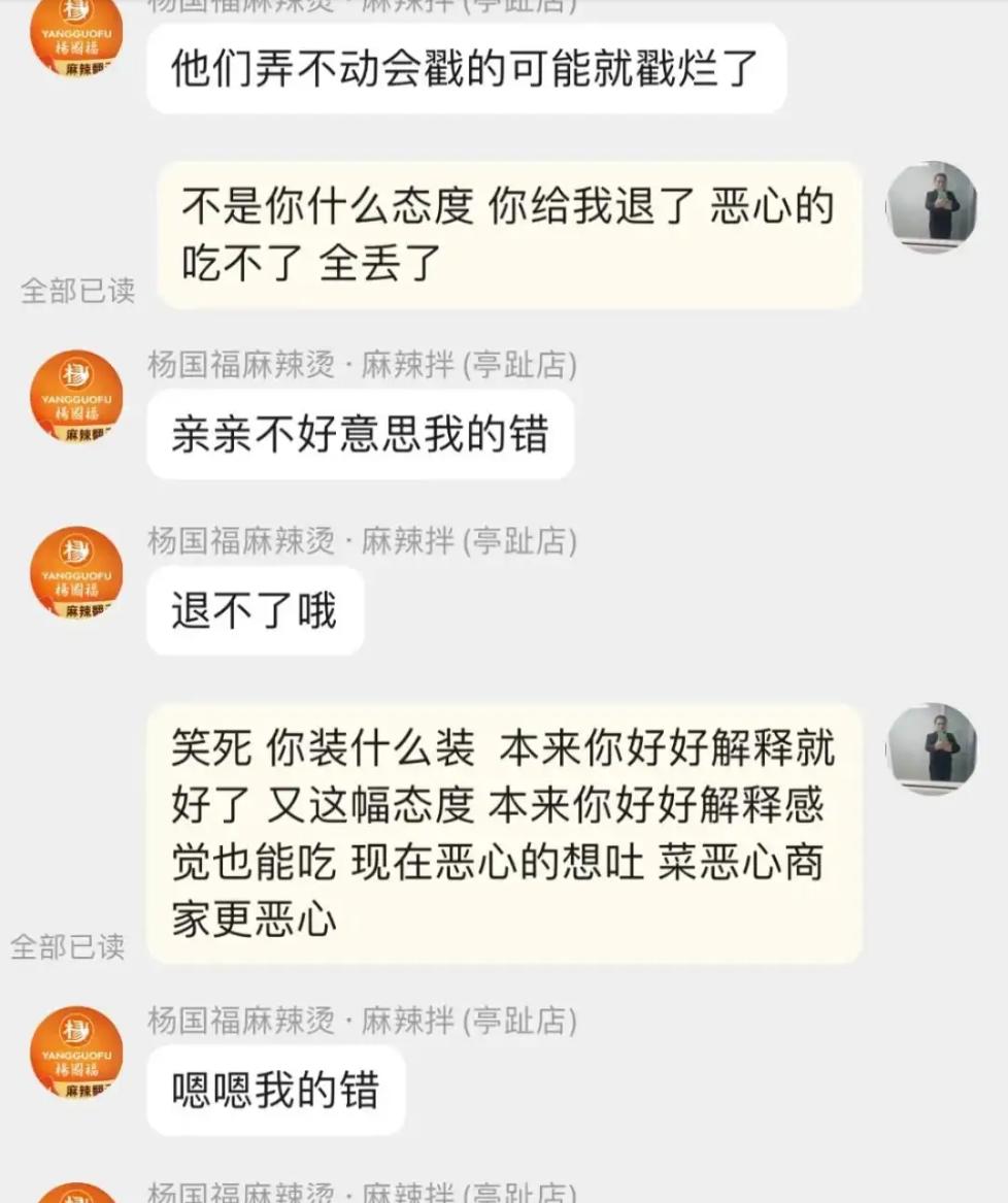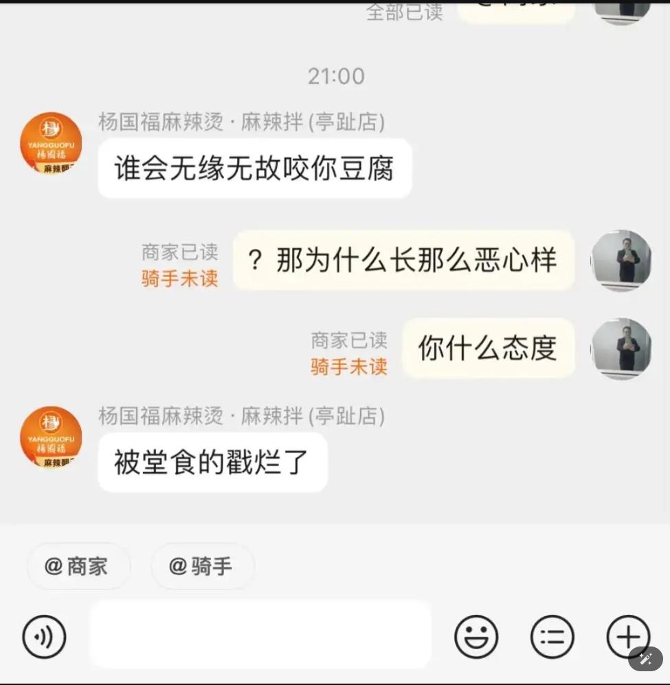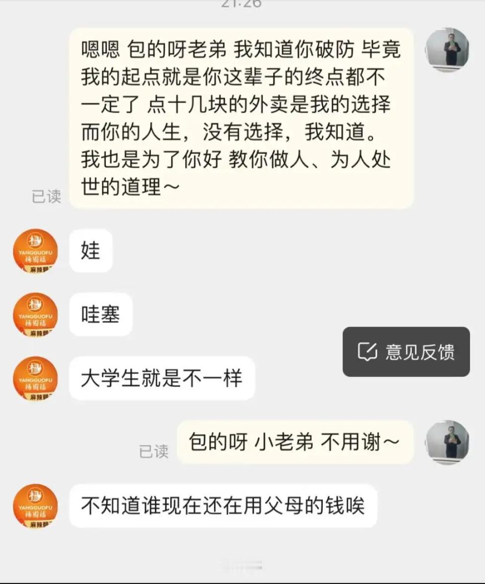 一块豆腐引发的“人生攻击”:大学生骂月薪2000的店主脏手,反遭全网嘲讽! 就因为外卖麻辣烫里的豆腐缺了个角,一位大学生和商家吵上了热搜!😤 本来事儿不大——豆腐可能是打包时碰坏了,商家也赶紧解释。 可这位同学火气噌就上来了,连发一串问号:“被人咬过吗?你这什么态度!” 商家回了一句“谁会咬你豆腐”,他直接炸毛开骂:“菜恶心人更恶心!你这辈子吃不上两菜一汤!” 好家伙,商家也没忍住:“总比你强,点个十块钱的东西嘚瑟啥?” 这句话彻底点燃战火!大学生开始疯狂输出“人生 superiority”: “我的人生是旷野,而你双手脏污没文化!” “我起点是你终点,你月薪2000我随便花!” 还自称有房有车无压力,狂踩对方是“底层打工人”。 他本来想发聊天记录让大家一起骂商家,结果评论区翻车翻得彻底!🙊 网友几乎一边倒: “书读得多就可以看不起人?” “真正的高认知是尊重,不是贬低!” “你这么牛还点麻辣烫?米其林不适合你吗?” 要我说,真别把学历当令箭,素质纔是硬通行证。 嘴上谈认知、格局,行为却暴露了真正的狭隘。 靠双手吃饭的人,比靠爹妈炫耀的人,值得尊重一百倍! 💬结语: 你可以选择吃什么,但没资格鄙视为你做饭的人。 社会现象 高学历不等于高素质 尊重每一份工作