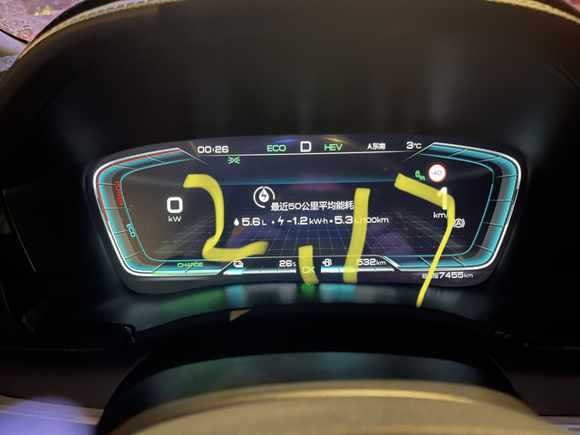 车已经开了7455公里来报下油耗 我的车是宋PLUS DM-i 2021款DM-i 51KM 两驱尊荣型,在南京开得比较多些。 纯亏电情况下,百公里油耗是4L。 加满油400元,开了974公里,期间没高速,最快90,中间在车里吹空调打了两小时手机,所以综合下来应该可以算1000公里