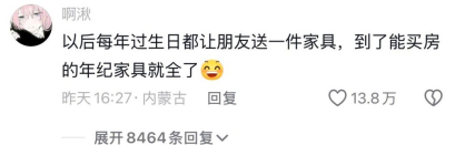 以后每年过生日都让朋友送一件家具,到了能买房的年纪家具就全了