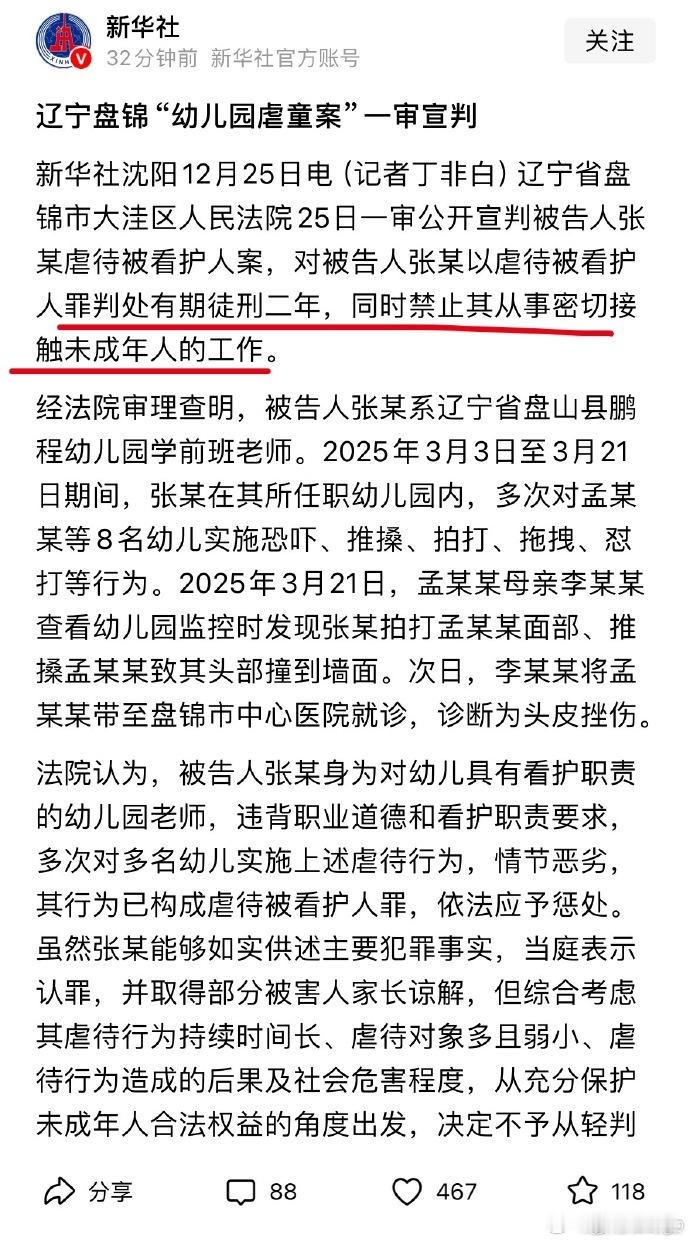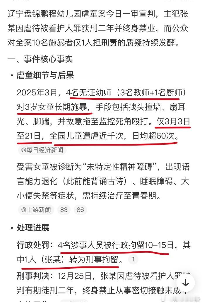 盘锦虐童幼师被判二年 什么?才判了两年?700多天?按照虐童千次以上这个数据看,虐童/天/次去量刑 是不是也得1000多天·····就可怕,这种狼心狗肺的行为真的不配为幼师“十几天虐童近千次”的案件,罪犯最终被判处有期徒刑二年同时禁止其从事密切接触未成年人的工作除此之外,还有三人之前已被行政拘留 辽宁虐童幼儿园永久关停 受害孩子的爸爸说,用移动硬盘去存储监控的虐童视频频次和人数次数都太多了,截止今天都没有看完整个视频太tm恐怖了,这种罪犯······真的,能不能加点古代酷刑