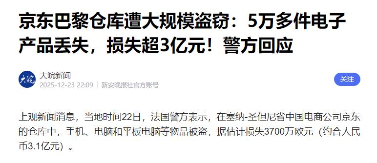 京东巴黎仓库被洗劫3个亿,很多人以为是法国治安太差,遇上了流氓。错了!真相是,这是一场精准到秒的“内鬼级”军事行动! 能精准定位30个装满手机的托盘,能让红外报警和监控全部物理瘫痪,这绝不是路边小偷能干出来的,这是有人拿着仓库图纸,在给强盗开路!   要搞懂这件事,就得从行动的每一个细节里找线索,这些线索串联起来,就会清晰指向内鬼的存在和行动的军事级专业性。   京东这个仓库是服务欧洲市场的核心备货枢纽,当时正值圣诞购物旺季,仓库里囤积了大量荣耀、OPPO手机、平板电脑等高价3C产品,而这些高价值货物的存放位置、托盘数量,只有仓库内部人员才能精准掌握,这也是团伙能直接锁定30个装满手机的托盘的关键前提。   更能证明这是内鬼主导的军事级行动的,是团伙对仓库安防系统的精准破坏。行动开始前,团伙已经通过内鬼摸清了仓库监控设备的安装位置、线路走向以及警报系统的运行机制,甚至可能提前知晓了警报系统当晚处于维护疏漏状态的关键信息。   行动中,团伙成员分成两组同步作业,一组携带专业的电磁干扰设备和拆卸工具,直奔仓库外墙的监控设备区域,不仅精准破坏了所有内部视频监控摄像头,还直接摧毁了后端存储服务器,彻底切断了影像证据链,整个过程没有产生明显声响,避免惊动仓库内的少量值班人员。   另一组则直接冲向仓库主入口,没有采用暴力砸门这种粗放方式,而是用专业工具精准拆卸大门铰链,既高效又最大程度减少了破坏痕迹,这种专业操作手法,只有熟悉仓库大门结构或者掌握相关图纸的人才能做到,而这些信息显然来自内鬼的提前泄露。   要知道,仓库的红外报警和监控系统都是为了防范外部入侵设计的,具备完善的防护机制,要实现全部物理瘫痪,必须精准找到系统的薄弱点,这绝非普通盗窃团伙能具备的能力,背后必然有内部人员提供的详细仓库图纸和安防布局图,相当于有人在前面为强盗开路,让整个安防系统形同虚设。   行动的精准性还体现在时间把控和人员分工上,完全符合军事行动的协同作战要求。团伙提前通过内鬼掌握了仓库的值班人员数量、安保巡逻间隙和换班节点,甚至通过观察仓库外部灯光变化和人员流动,最终确认当晚仓库内仅有少量值班人员,为行动锁定了最佳时机。   晚上22点左右,3辆经过伪装的大型货车已经悄然停靠在仓库周边的隐蔽区域,车内成员完成最后的工具检查和行动确认,随后两组人员同步行动,从破坏监控到潜入仓库,整个过程衔接无缝。   进入仓库后,团伙成员没有任何多余动作,直接直奔存放高价值3C产品的区域,对着提前锁定的30个托盘展开搬运,与此同时,还有专门的人员负责操作设备篡改托盘的RFID标签。   这种标签是仓库货物管理系统的核心,篡改后仓库的WMS系统就会误判这些货物是正常出库,为团伙撤离后争取了更长的发现时间,这一操作再次证明团伙不仅掌握货物位置,还熟悉仓库的管理系统,而这些信息只有内部人员才能接触到。   整个搬运过程仅用了2小时,5万多件商品就被整齐有序地装载到3辆货车上,分工明确、效率极高,从潜入、定位、搬运到篡改数据,每一个环节都精准到秒,这种协同作战能力,已经远超普通犯罪团伙的水平,完全是军事级别的行动部署。   行动结束后的撤离环节,同样凸显了策划的周密性和内鬼的关键作用。装载完成后,团伙成员对装卸区域进行了简单清理,收起了散落的包装碎片,没有留下明显的工具残留和个人痕迹,随后3辆装满赃物的伪装货车按预设路线有序驶离。   根据仓库周边后续调取的模糊影像显示,货车驶离时没有开启大灯高亮模式,专门避开了主要交通要道的监控点位,这种对周边路况和监控布局的精准掌握,显然也离不开内鬼的提前踩点和信息提供。   如果是普通流氓作案,得手后只会仓皇逃窜,根本不可能有如此从容的撤离安排,更不可能精准避开所有监控点位。   而法国警方介入调查后,初步判断团伙对仓库信息了如指掌,不排除内部人员泄密的可能,这一结论也印证了内鬼存在的猜想。   这场行动造成的损失初步估计达3.06亿元人民币,虽然京东回应称网传损失数额与实际情况有较大出入,但不可否认的是,这绝非普通盗窃事件。   从精准锁定高价值货物、精准破坏安防系统,到协同高效的搬运操作、从容有序的撤离安排,每一个环节都离不开内鬼提供的核心信息,每一个操作都展现出军事级的专业性。   目前法国警方已经交由打击团伙犯罪大队接手侦办,重点排查销赃渠道和仓库内部人员,相信随着调查的深入,内鬼的真实身份和整个行动的策划细节会逐步浮出水面,但无论如何,这场事件都已经清晰地揭示了内鬼在其中的关键作用,也让人们看清了这绝非简单的治安事件,而是一场精心策划的内鬼级军事行动。   对于此事,你怎么看?欢迎评论区留言讨论。