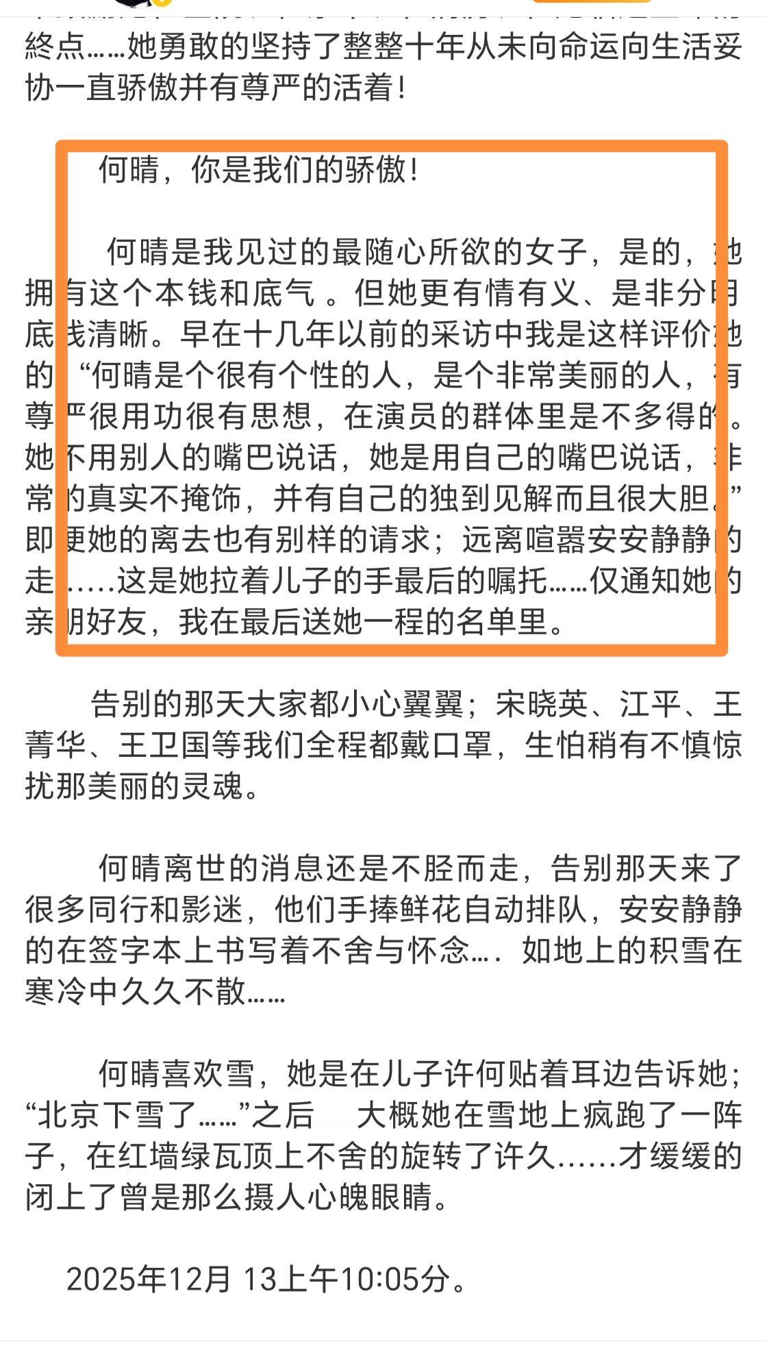 何晴的好友徐松子长篇悼文曝光,一个细节看哭了所有人:12月13日,徐松子收到许何的短信——松子阿姨,妈妈走了,十点零五。正在赶回北京路上的她,当场泪崩。 那天是北京的大雪天,路面结冰,徐松子和王菁华急着想见老友最后一面,却始终被雪阻在路上,手机屏幕亮起的那一刻,她知道所有的希望已经没了。许何,是何晴的儿子,也是这场十年抗癌路上最坚定的守护者。 十年前,何晴被查出脑瘤。那时许何才十四岁,少年本该无忧无虑,却在母亲病倒后选择从父亲家搬出,肩上扛起照顾她的责任。 这十年,他一直在病床边守着,既是儿子,也是依靠。外人夸他懂事和孝顺,何晴总是笑着回应,可眼底总藏着心疼与歉意,她知道,这场病让孩子提前长大,也让她一遍遍问别人:我会好起来吧? 徐松子比谁都清楚,这个朋友曾经历怎样的起伏。她们因拍戏结识,四十年的交情,从片场到生活,彼此都参与了对方的喜怒哀乐,徐松子看着何晴在荧幕上绽放光彩,走进婚姻、生子,再面对人生低谷,每一步都陪着她。 得病那年,徐松子整夜流泪,不理解命运为何如此无情。可无情之外,还是要咬牙走下去,何晴的妹妹何畅和许何,在她生命最后阶段一直陪着,这份亲情支撑她走过了漫长的治疗期。 而这一次,大雪阻断了徐松子回去的路,也让她失去见好友最后一面的机会,她知道何晴爱雪,那一刻,她甚至觉得,这场雪是她的告别。 何晴生前淡泊低调,不愿惊动太多人,离开时只让儿子通知至亲和最好的朋友。徐松子在名单里,尽管没握住她的手,却还是赶上送最后一程。之后,她写下了那篇悼文,用最真诚的字,记下了何晴的善良与坚韧,也记下了这段四十年如一日的友情。 何晴的生命定格在61岁,不算长,但足够厚重,她在艺术上留下经典影像,在生活中收获过真爱与友情,还有一个愿意一生守护她的儿子。在观众和朋友心里,她的名字和那些角色一起长存。 生命无常,但何晴走得清清楚楚,也活得彻彻底底。雪落那天,她走了,可她留下的,比她拿走的更多。