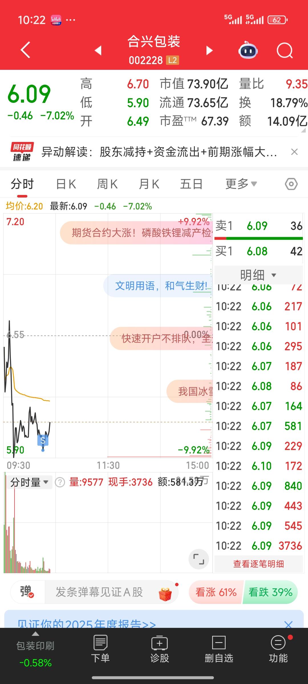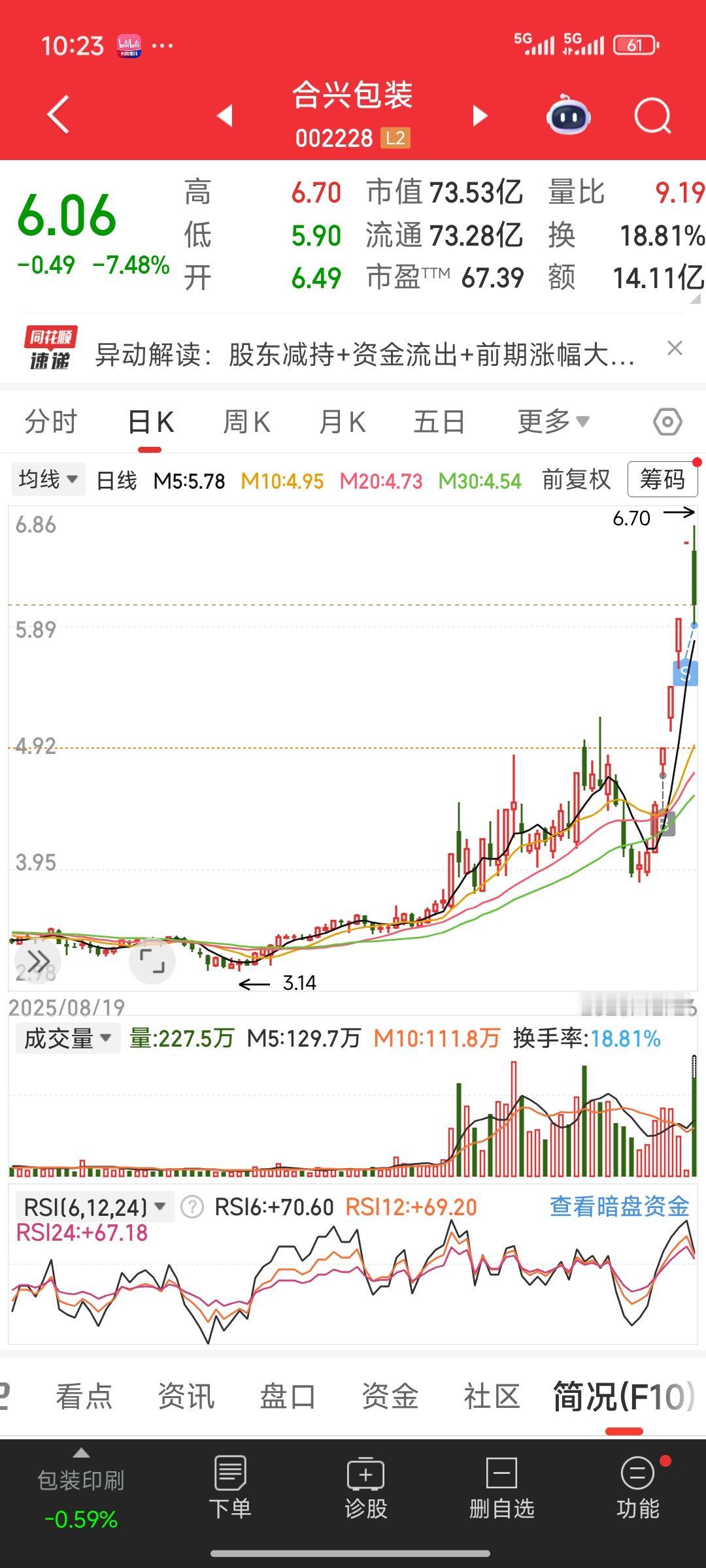 向兄弟姐妹们汇报一下,今天我把合兴包装卖了。从礼拜一涨停时追入,之后连续星期二、星期三、星期四三个涨停。今天进行了大幅调整,胆子大的可以考虑买入分岐。但我们胆子小的,今天一看快跌停了,实在扛不住,就在接近跌停的地方卖了。盈利从30%变成了20%,不过一个礼拜能收获20%,我已经特别开心了。虽说就买了几手,赚点饭钱,也是件让人开心的事。