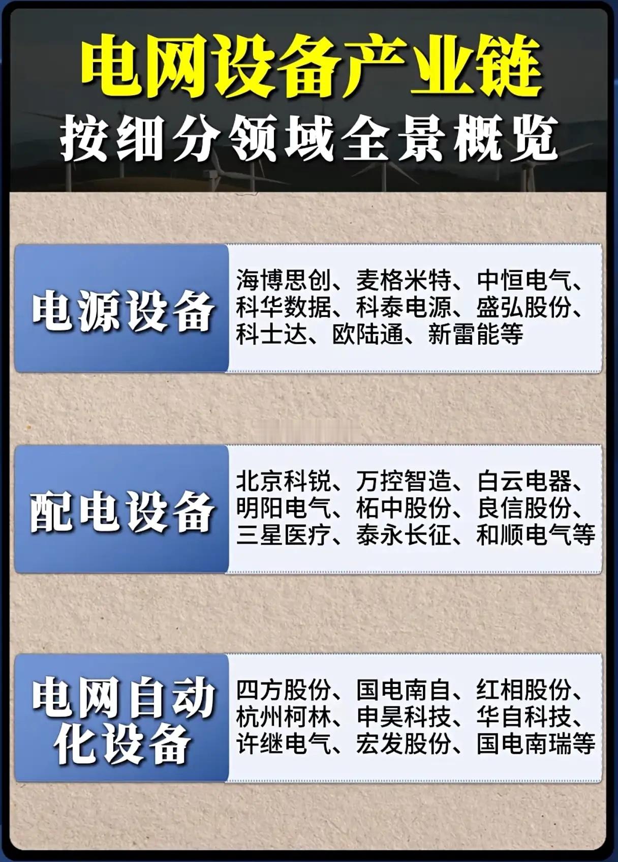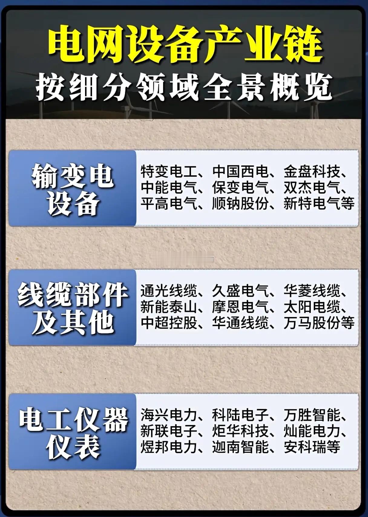 十五五电网投资剑指4万亿,电网设备企业能否抢占全球先机?券商预测“十五五”期间我国电网投资将突破4万亿元,较“十四五”2.8万亿元的规模大幅提升,这一重磅数据让电网设备产业链再次成为市场焦点。从全球产业格局来看,我国电网设备早已站稳全球领先地位,在线缆部件、输变电设备等核心领域的竞争优势尤为突出,这也为国内企业承接巨额投资红利奠定了坚实基础。电网设备产业链细分领域百花齐放,各赛道龙头企业各展所长。电源设备领域有海博思创、科华数据等企业深耕技术;配电设备赛道聚集了北京科锐、白云电器等骨干力量;电网自动化设备则由国电南瑞、许继电气等巨头引领创新。输变电设备板块,特变电工、中国西电等企业技术实力雄厚;线缆部件领域,通光线缆、太阳电缆等企业占据市场重要份额;电工仪器仪表赛道也有海兴电力、科陆电子等企业持续发力。随着全球电力缺口扩大与新型电力系统加速迭代,电网设备的需求场景不断拓宽。国内企业不仅要把握国内4万亿投资的机遇,更要凭借技术优势角逐全球市场。在特高压、智能电网、新能源配套等新需求驱动下,电网设备企业能否持续突破技术壁垒、扩大海外市场份额,将成为其抢占全球产业先机的关键,而这也将深刻影响我国在全球能源装备领域的话语权。